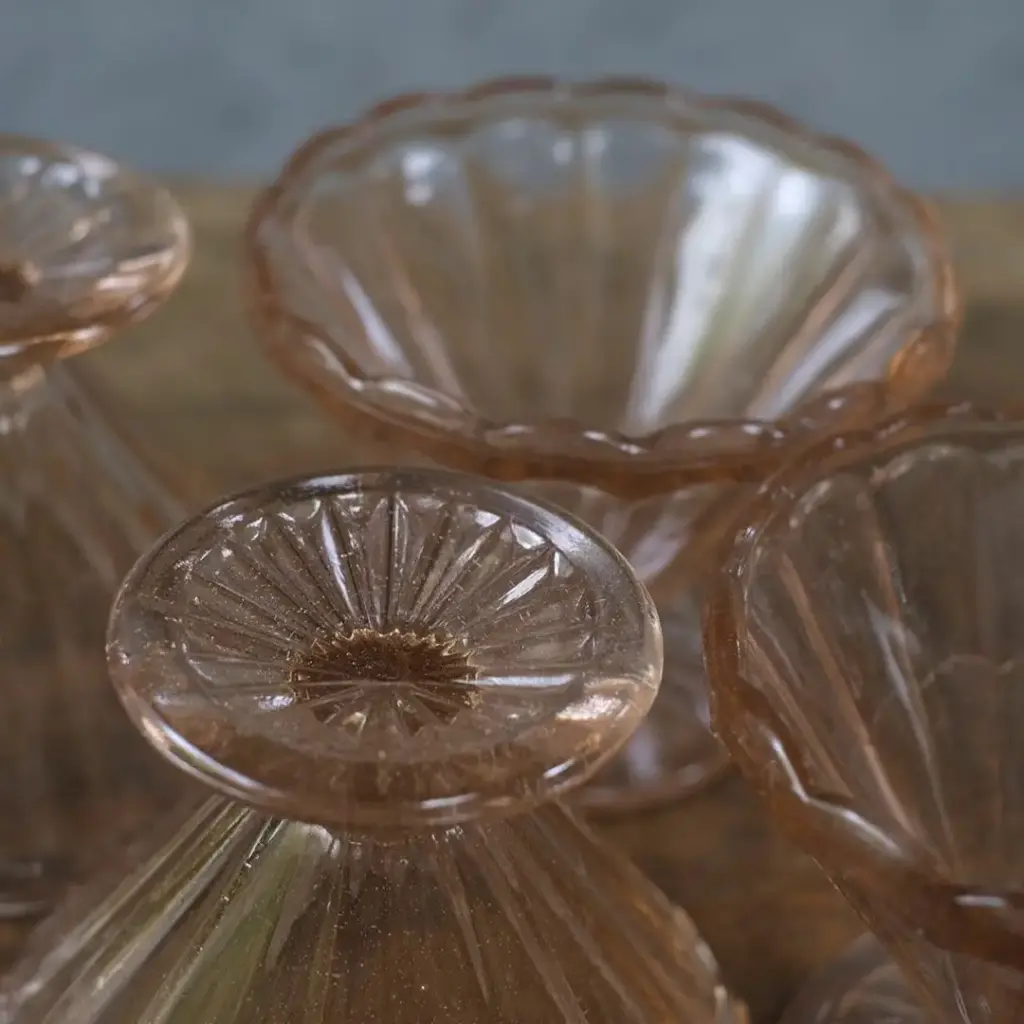 ピンクの透明ガラスが涼し気なアンティークのアイスクリームカップです。 アールデコの時代の流行が取り入れられており、直線的でどこかモダンな印象を与えます。