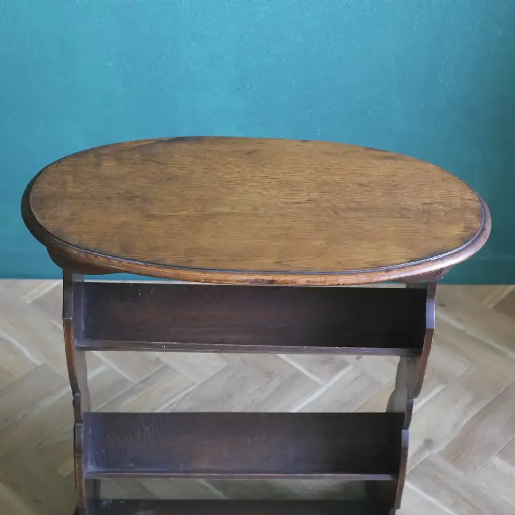 オークを使ったイギリスの重厚なアンティークマガジンラックテーブル。 普段の暮らしにさりげなく取り入れらえるアンティーク家具です。