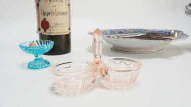 アンティーク サリエール (塩入れ)フランス ピンクの小さなガラス製スパイスディッシュ/アンティーク食器 淡いピンクが可愛いプレスドガラスの小さなサリエール(ソルト&ペッパー入れ)美しいデザイン性と実用性を兼ね備えたアンティークのテーブルウェアです。