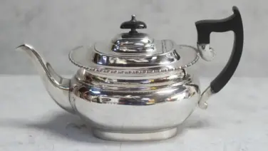 アンティークティーポット イギリス シルバープレートシェフィールド ぽってりとしたフォルムで容量たっぷりのシルバープレートティーポット。 ハンドルとつまみはシルバーティーポット定番の木材エボニー(黒檀)でできていてシルバーとブラックのコントラストが優雅に感じられます。