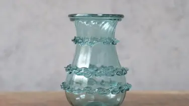 ヴィンテージフラワーベース 花瓶 青いガラス イギリス 厚みのある透明ブルーガラスに細やかな気泡や揺らぎが閉じ込められており、手仕事ならではの表情を宿しています。