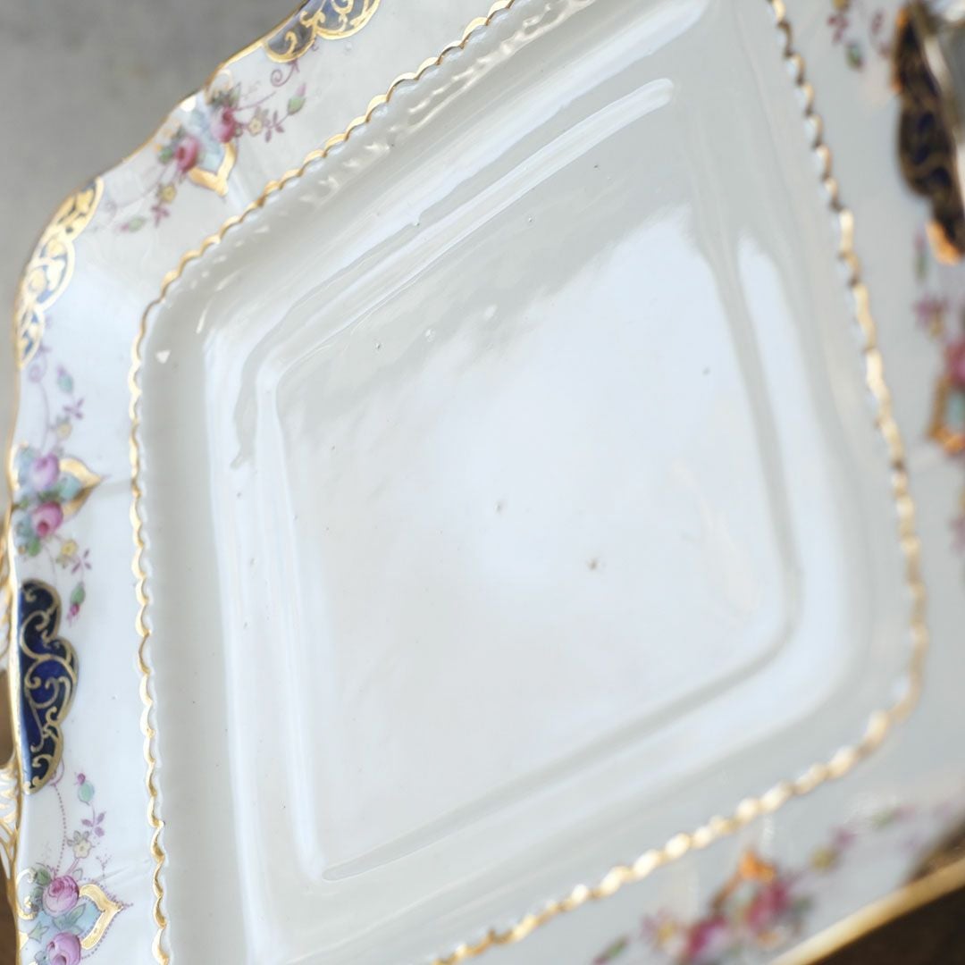 角のやわらかなスクエアフォルムに、さりげない金彩と小花を添えたヴィクトリアン・デザイン。キャビネットに立てかけて飾っても、食卓で実用しても、空間にすっとクラシカルな落ち着きを足してくれる一枚です。