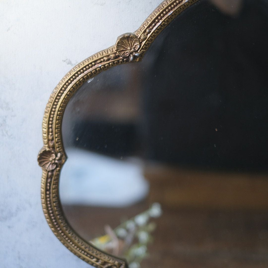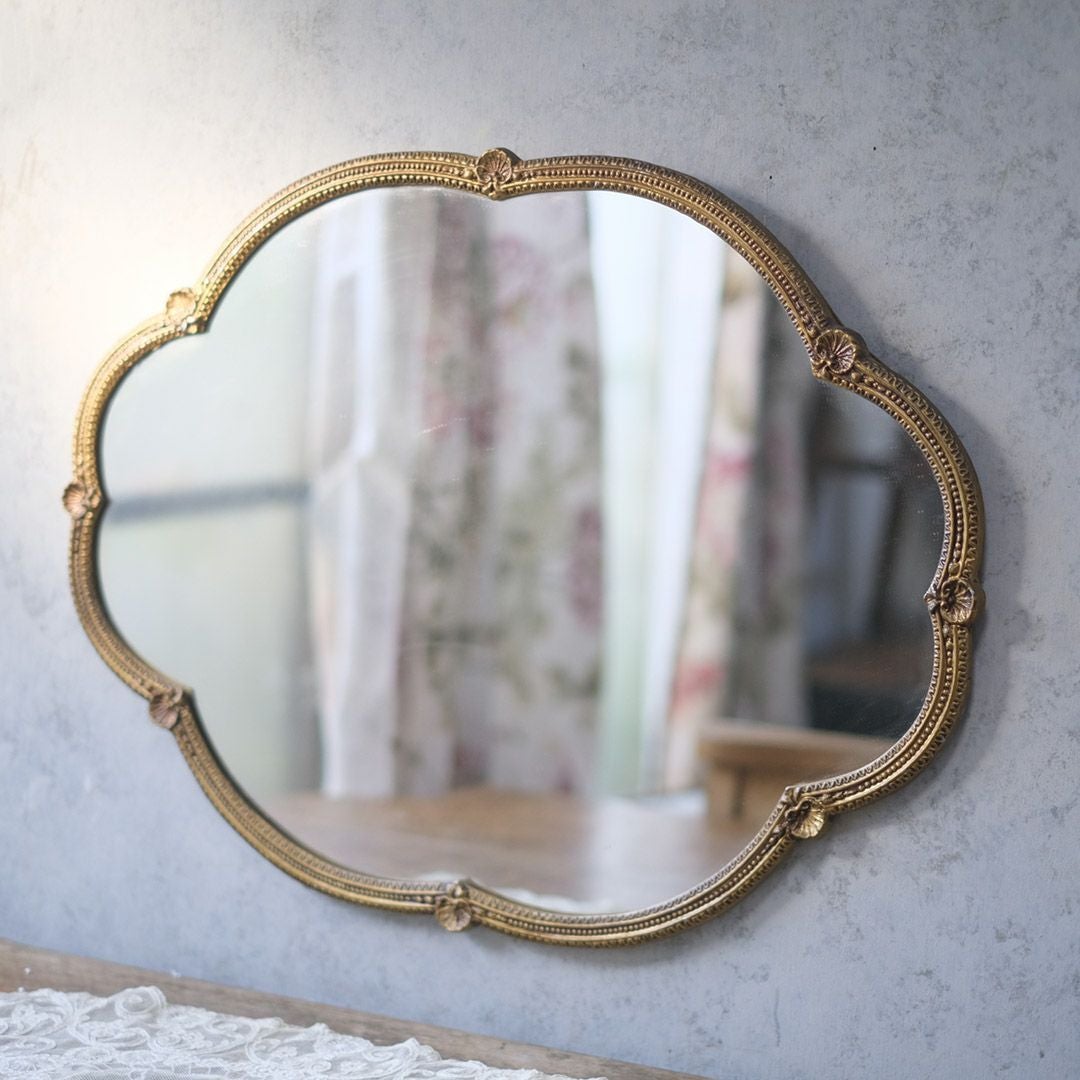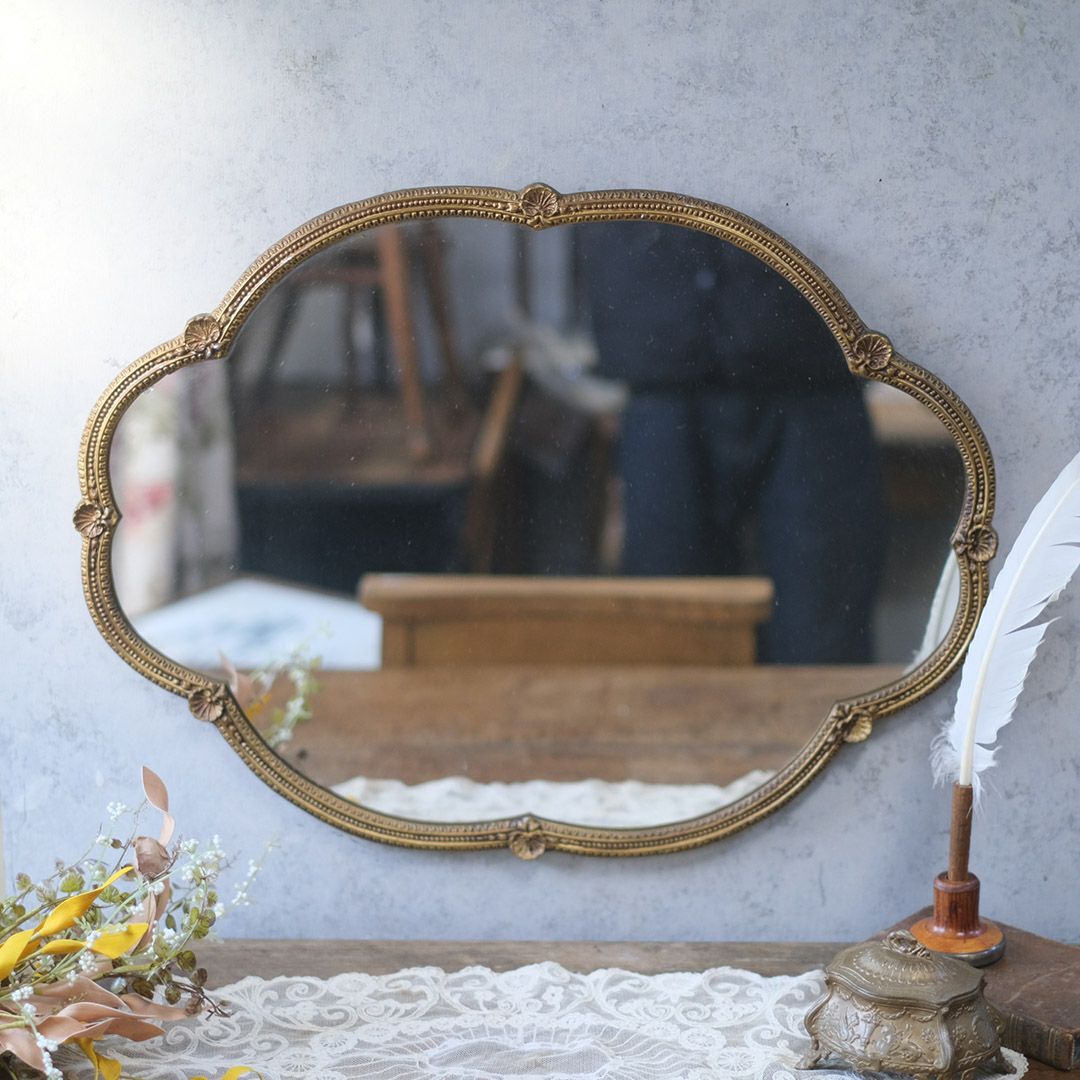 金縁は華美になりすぎず上品で、縁には面取りのような立体感があります。光が当たると輪郭がきらりと際立ち、アンティーク家具はもちろん、真鍮小物やキャンドルスタンドともすっと馴染みます。雰囲気はクラシックで、ヴィクトリア後期からエドワーディアン期のインテリアに見られる端正なオーバルデザインの系譜です。