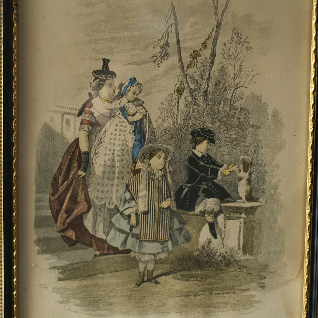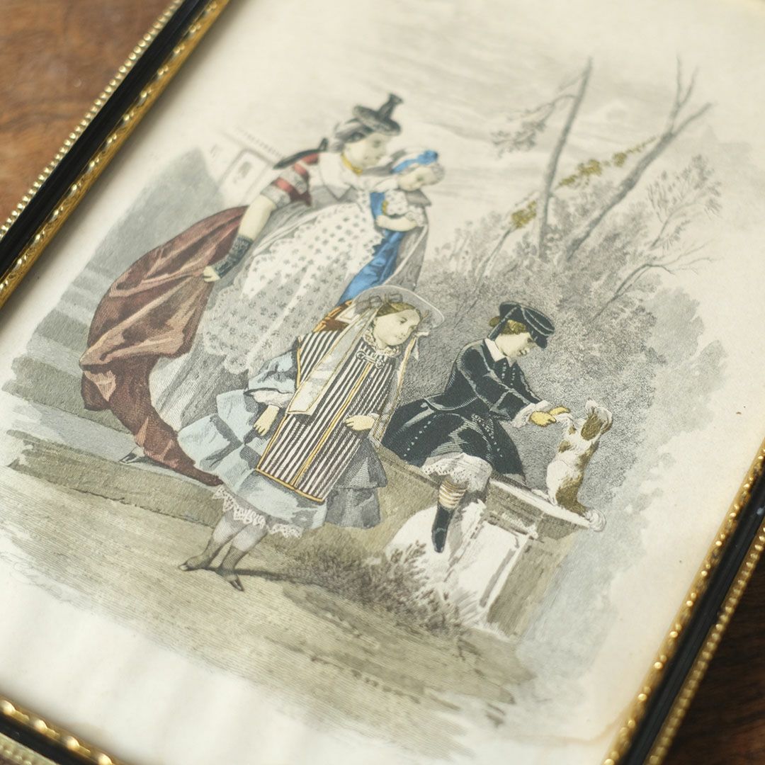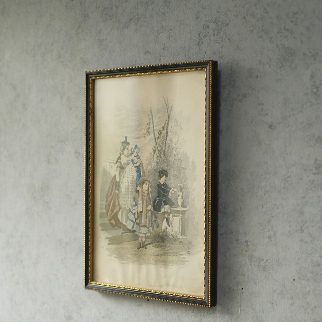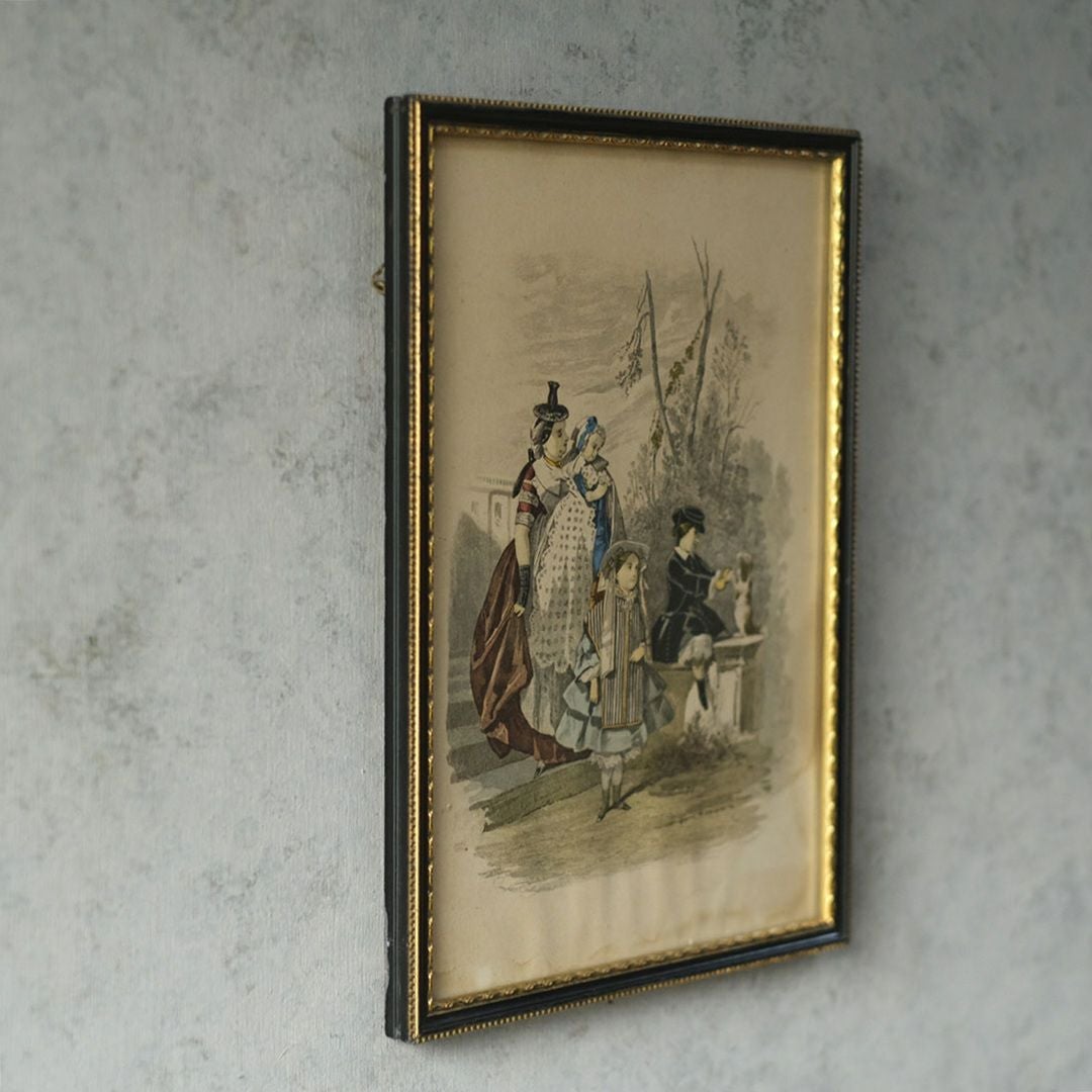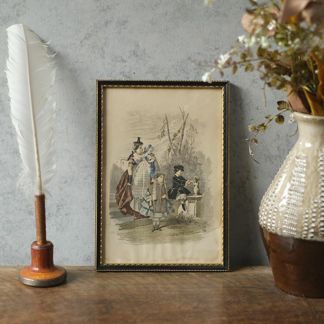 こちらは19世紀中頃(推測1850〜1860年代)のフランス製リトグラフ(石版画)作品で、パリで発行された女性誌の一枚を切り取ったもので、当時の上流階級の母娘の日常を柔らかいタッチで描いています。