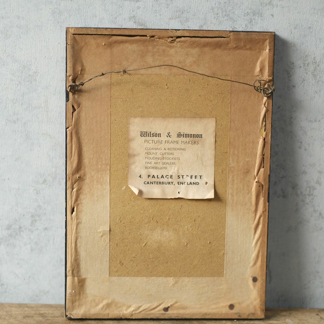 額装は英国製で、細やかな縁取りが施された真鍮トリム付きの木製フレームで、背景との馴染みも良く、空間に温かみとクラシックなアクセントを添えます。用いられている紙は経年変化によるヤケや滲みが見られますが、それがまたアンティークらしい味わいとなっており、雰囲気を一層引き立てます。