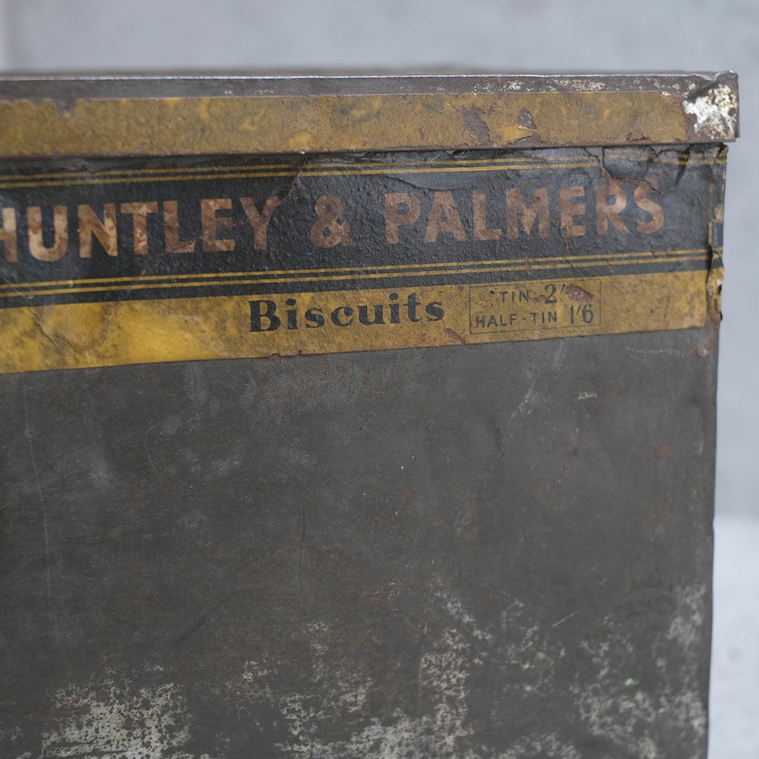 イギリスのビスケットメーカーHUNTLEY&PALMERS BISCUITSの大きなアンティークティンボックス。長い経年のため退色した質感がありながら当時のレトロなパッケージロゴが読み取れます。