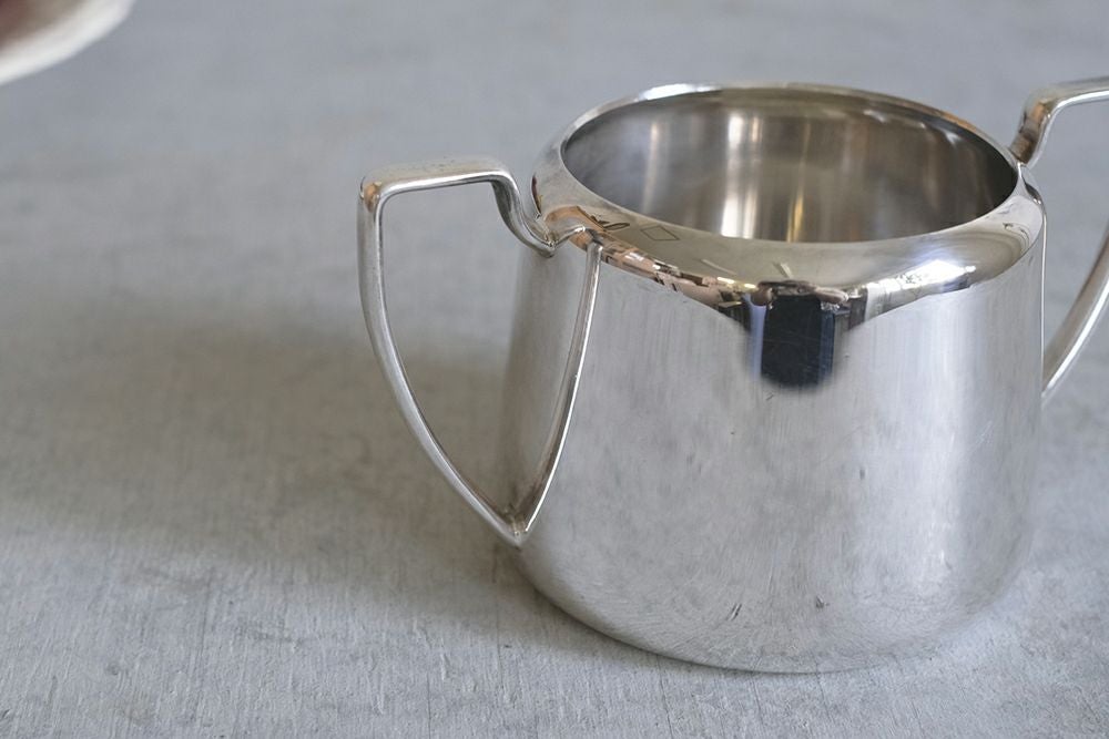 低い背に山型のかわいらしいシルバープレート製シュガーポット。高上がりのダブルハンドルが王道の美しさを誇っています。