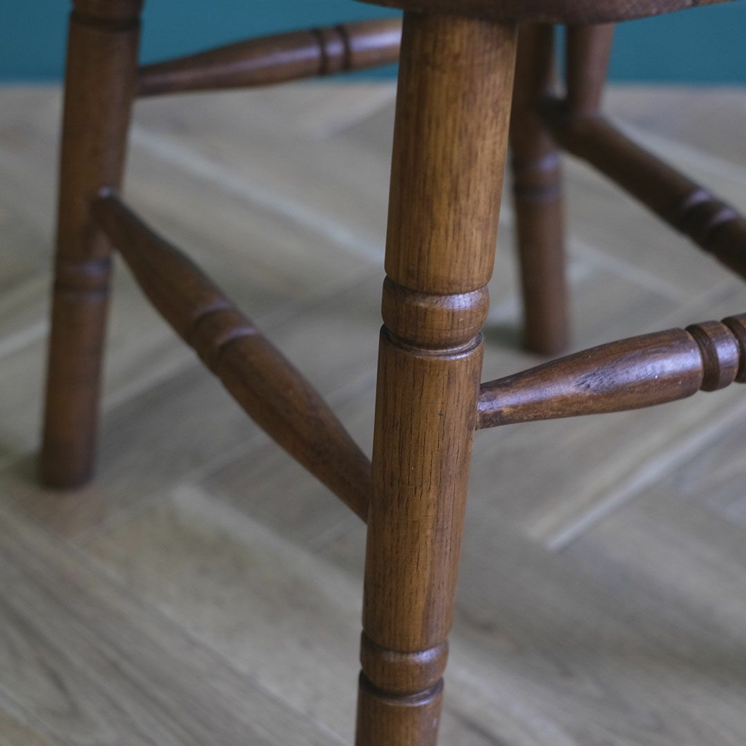 背もたれは4本のスピンドル(縦桟)で構成され、両端の支柱が背面より高く突き出したデザイン。素朴であたたかみのある雰囲気に、イギリスらしい田舎の暮らしが感じられる一脚です。