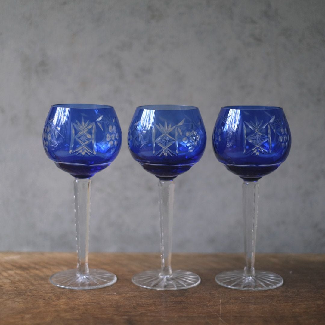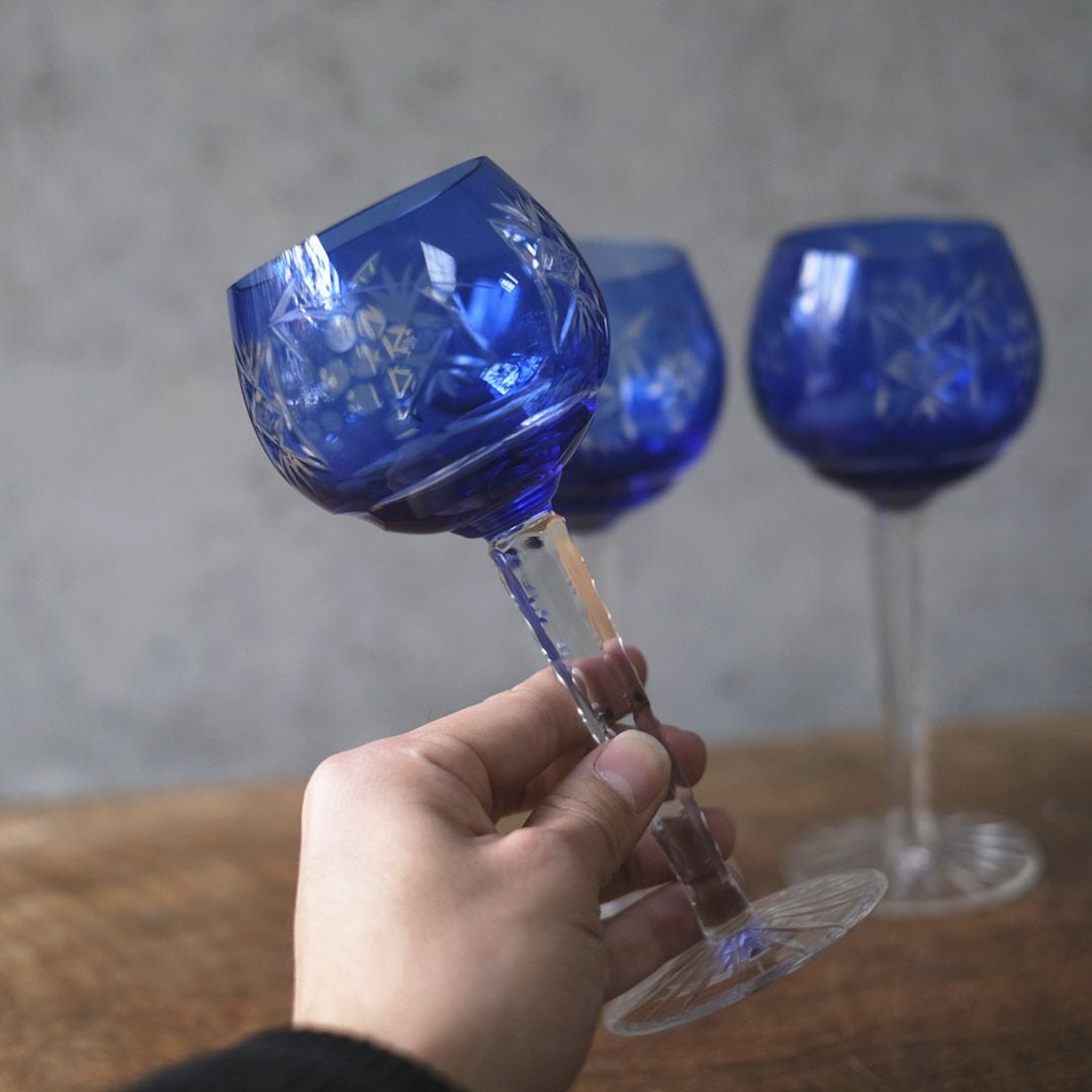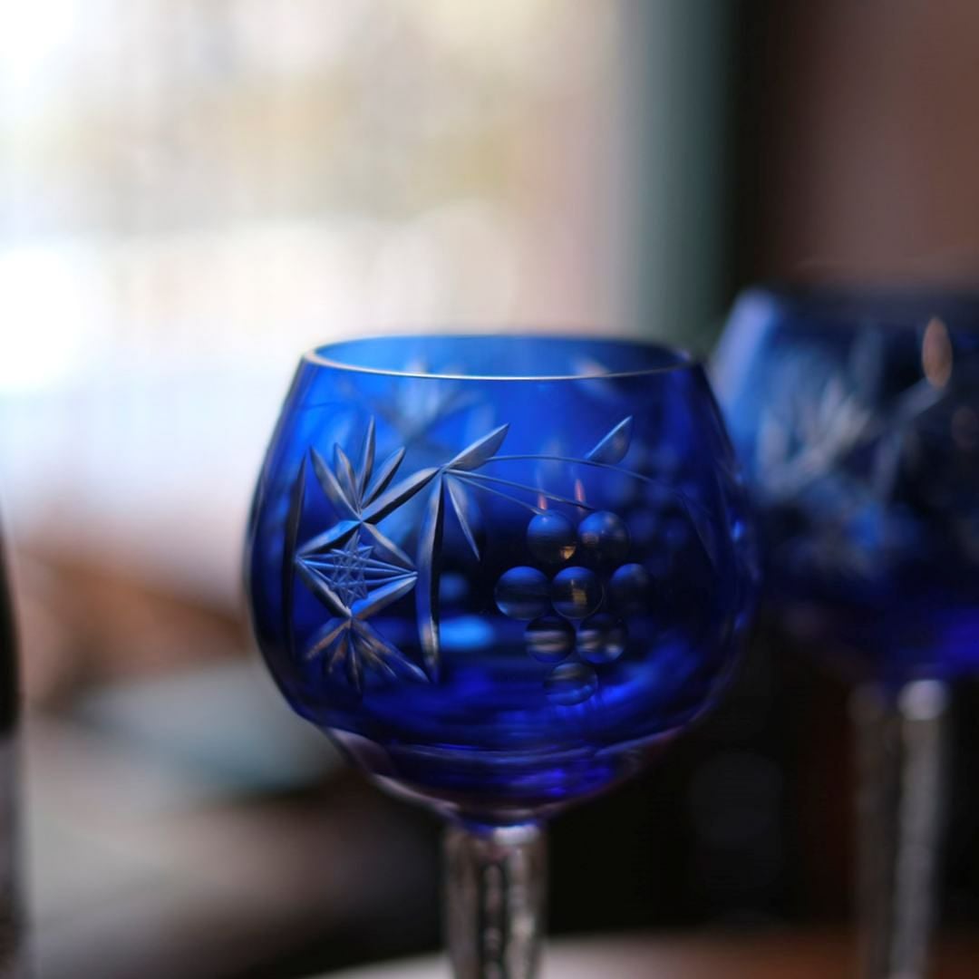 特徴は、色ガラスの発色の良さと、葡萄文様と幾何学カットの組み合わせ。写真の通りステムはクリアで、ボウルの青がより引き立つバランスでまさにボヘミア特有のクリスタル技術が生んだ美しさと言えます。