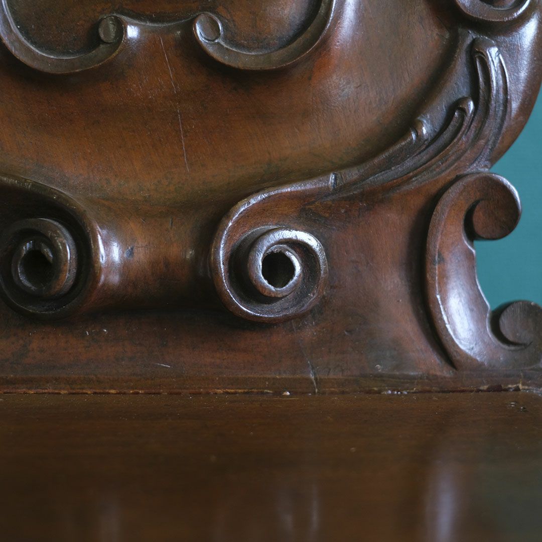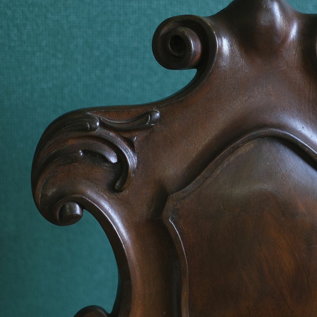 もともと邸宅のホールや大広間に、お客様を迎える“飾り椅子”として置かれていたホールチェアは、家具としての実用性だけでなく、空間を華やかに演出する役割も担っていました。背板にはロココ調の優美な彫刻が施され、正面の脚部はスピンドル仕様。複数の様式が融合したデザインは、まさにこの時代ならではの魅力です。