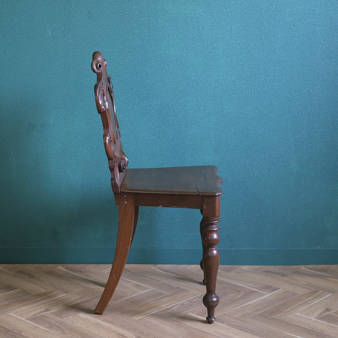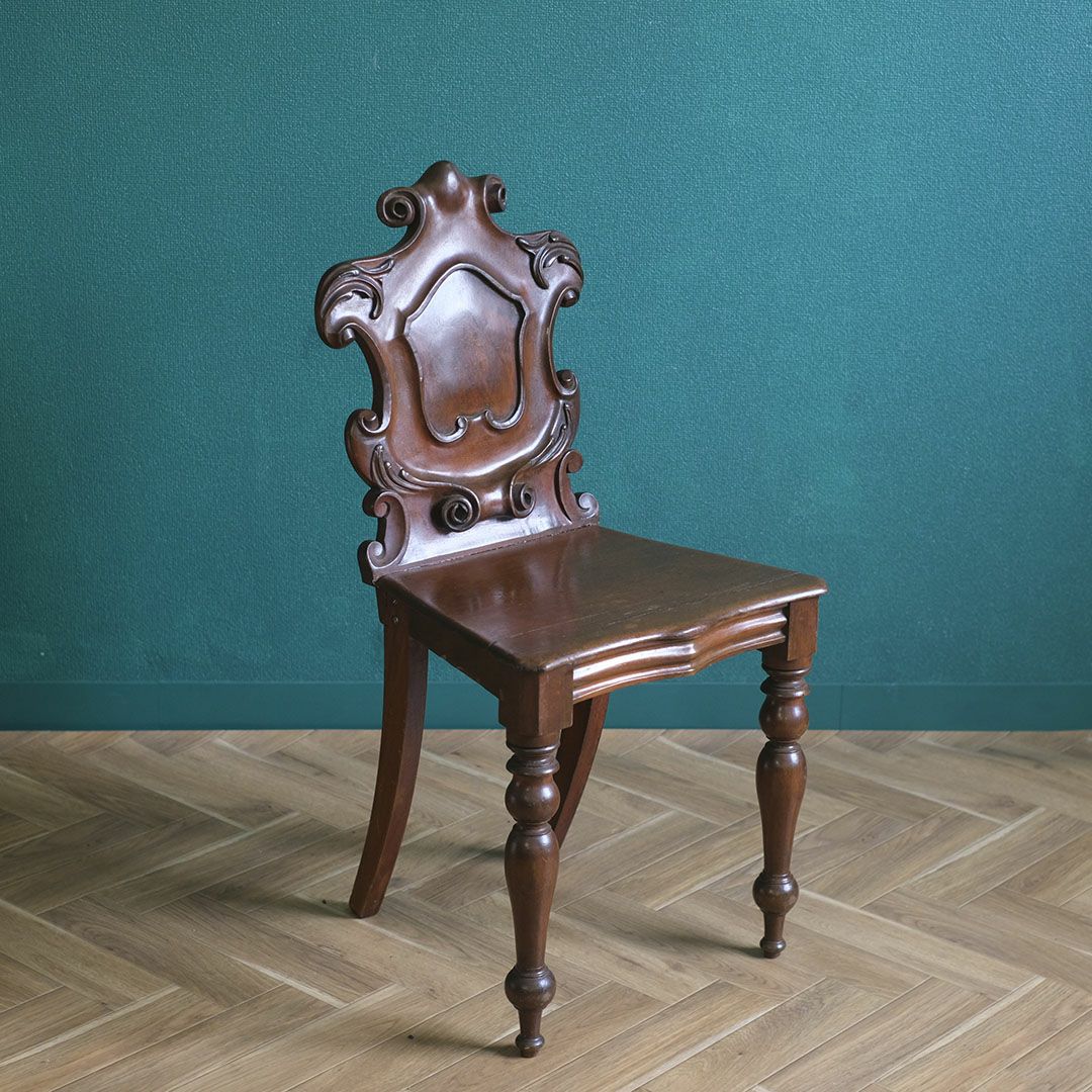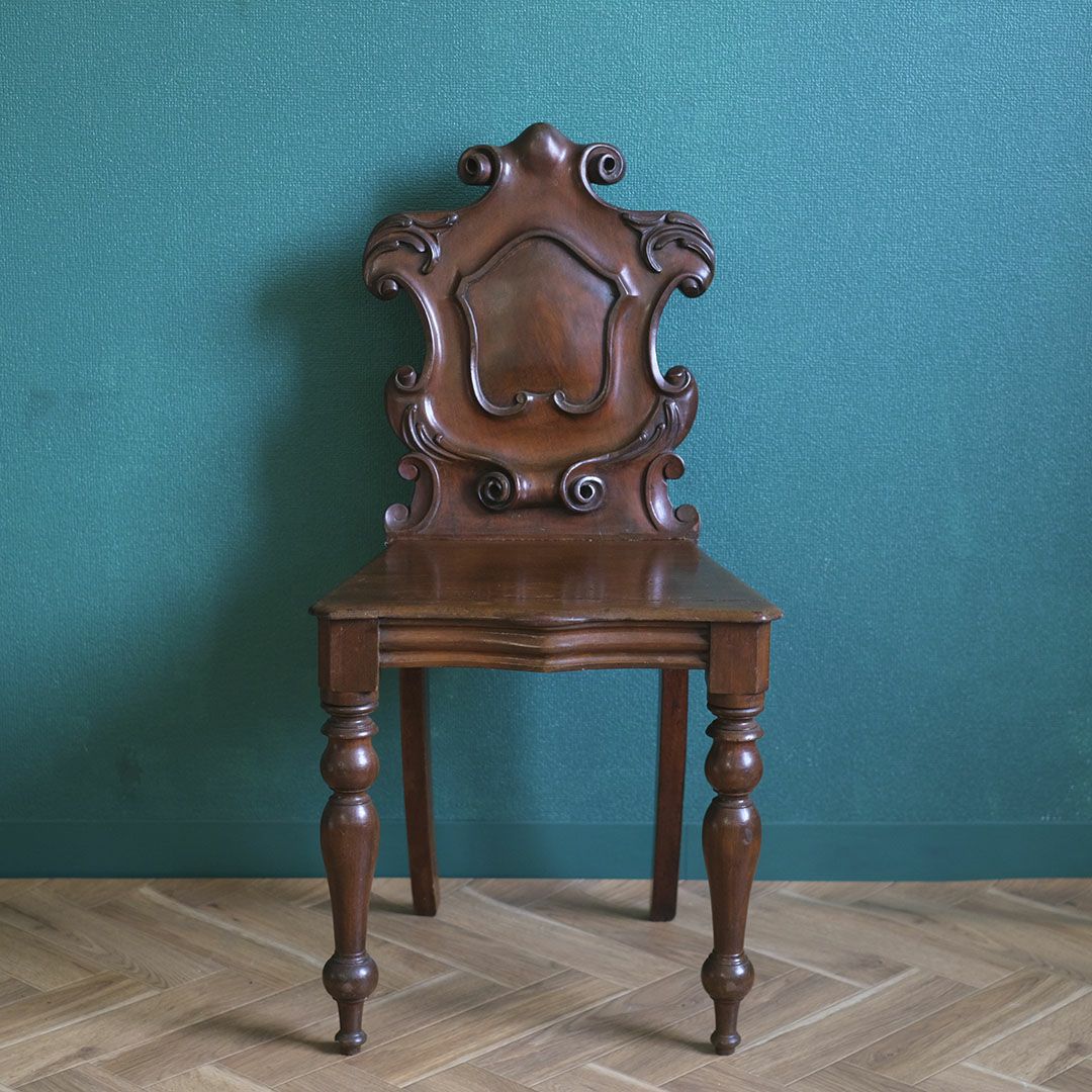 背もたれにほどこされた彫刻と、つややかな塗装がとても美しいアンティークホールチェア。