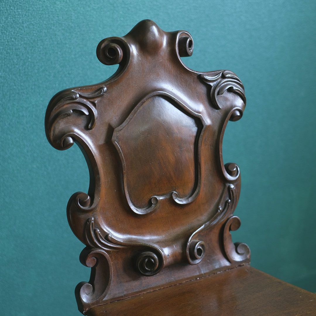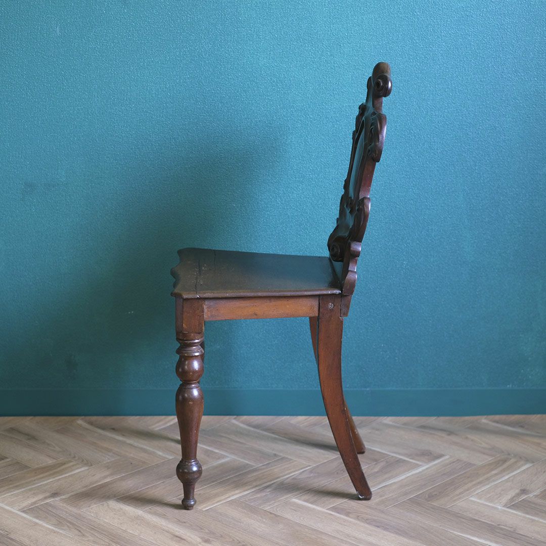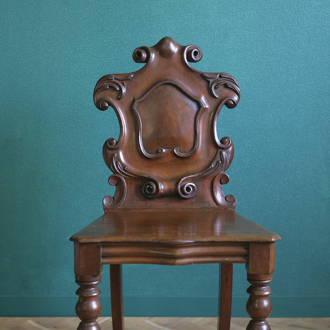 背もたれに施された繊細な彫刻と、深みのある艶やかな塗装が目を引く、上質なホールチェア。19世紀イギリス、ヴィクトリア時代の折衷様式(エクレクティック)を体現する、希少なアンティークチェアです。