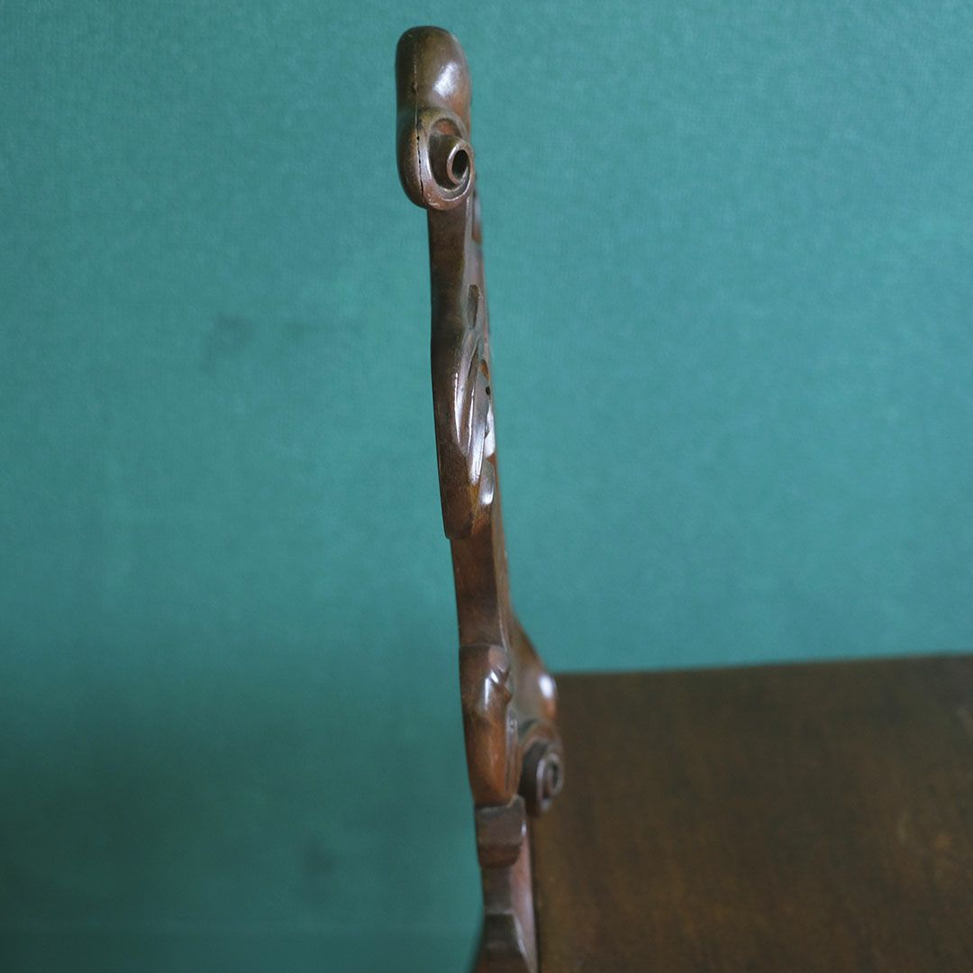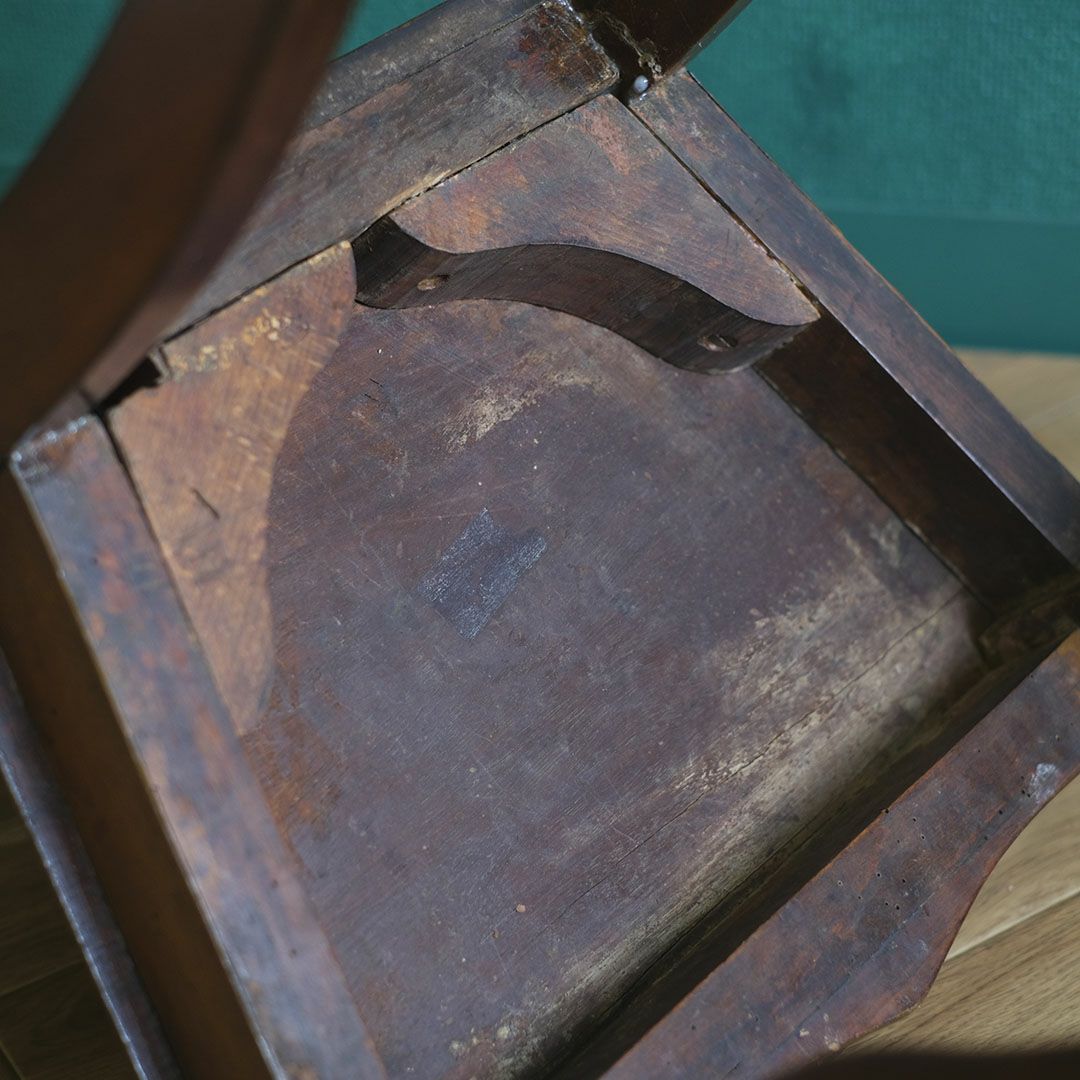 なお、構造にぐらつきが見られたため、いったん各部を丁寧に分解し、接合部の調整と組み直しを行っております。現時点ではしっかりとした安定感があり、安心してご使用いただけます。構造上背もたれと座面の接合部分が非常に細いため、無理な荷重を掛けないようにあくまで飾り椅子としてご利用ください。