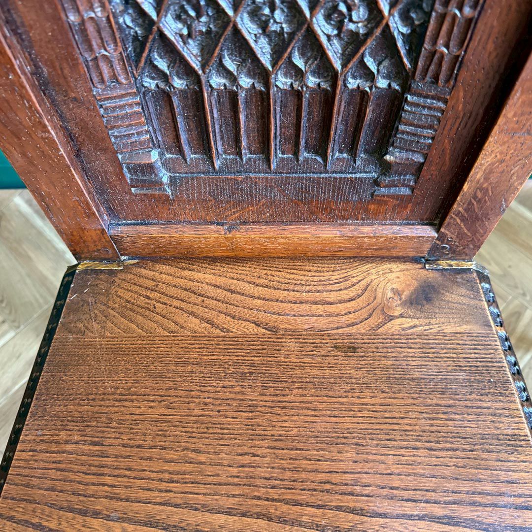 高い背板のトップにはゴシック建築を思わせる尖塔型の装飾、座面の縁には四つ葉を連ねた彫りが施され、細部まで職人技が光ります。年月を重ねたオーク材は深みのある色艶をまとい、英国アンティークらしい存在感を放ちます。