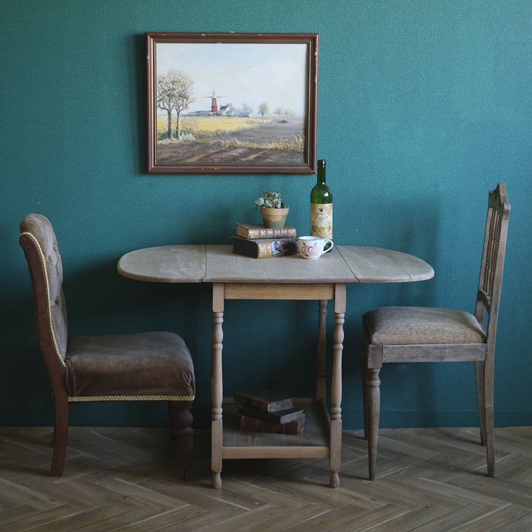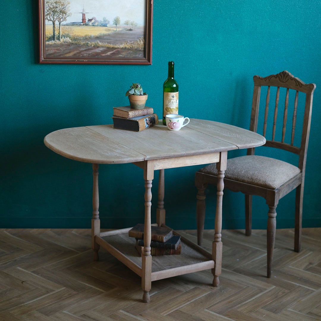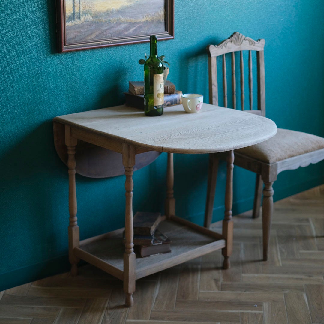 装飾を削ぎ落とし、木本来の木目や節、経年による濃淡をありのままに活かしたナチュラルな佇まいは、現代のモダンなインテリアや、日本の落ち着いた住空間とも驚くほど自然に調和します。二人で囲むささやかな夕食の時間にはもちろん、片側だけを閉じて壁際に寄せ、お気に入りのアンティークランプや洋書を飾るコンソールとしてお使いいただくのも素敵です。