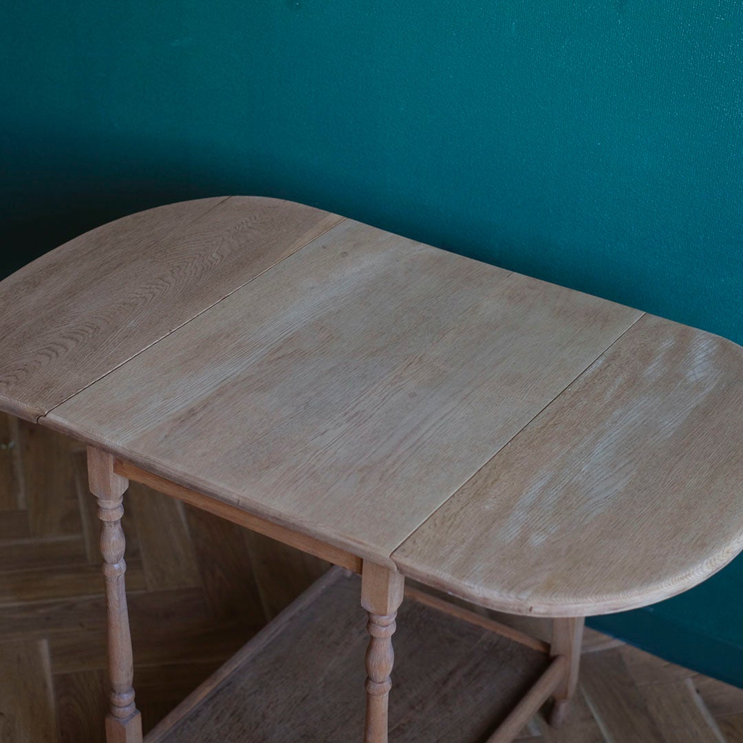 このテーブルの最大の魅力は、空間や用途に合わせて天板のサイズを自在に変えられるドロップリーフ(落とし込み)構造にあります。天板を広げる際に木の脚をスライドさせ、カチリと収まる手応え。そんな何気ない動作ひとつにも、当時の職人の堅実な手仕事と、一台の家具を大切に使い継いできたイギリスの合理的な美意識が感じられます。