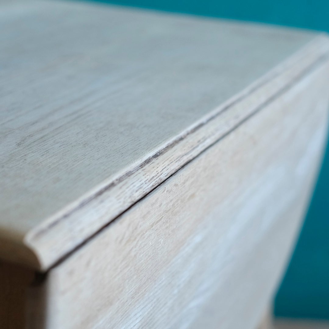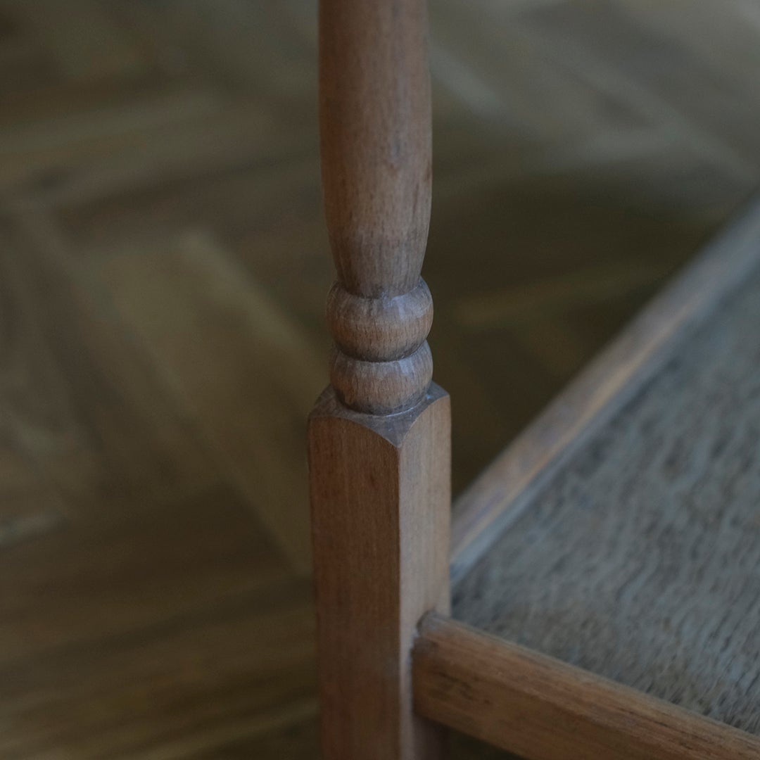 指先に触れると、塗装を丁寧に取り除いた剥離(ストリップ)仕上げならではの、さらりとした無垢の木の質感がダイレクトに伝わります。長い年月を経て使い込まれたイギリスのオーク材は、現代の家具にはない確かな密度と、古木だけが持つ穏やかな温もりを湛えています。