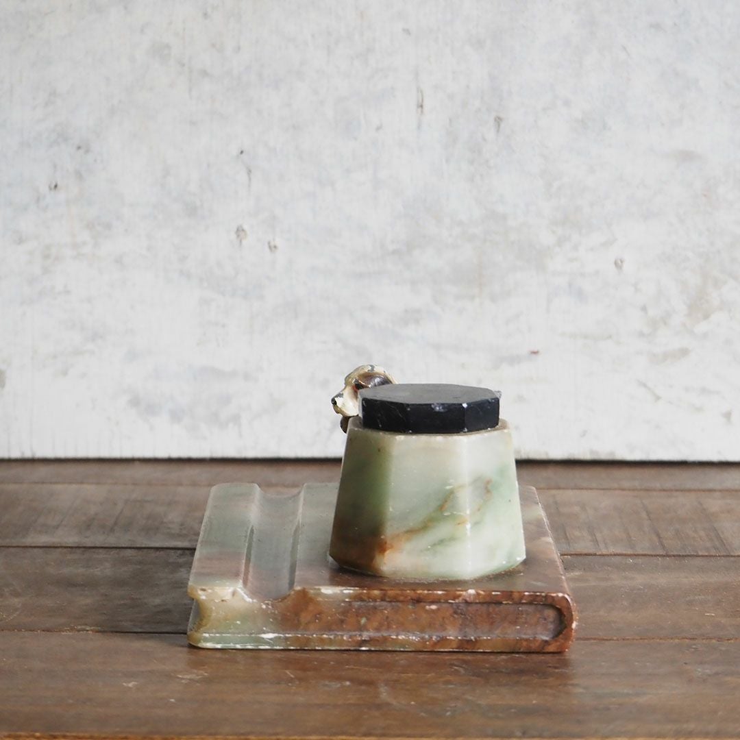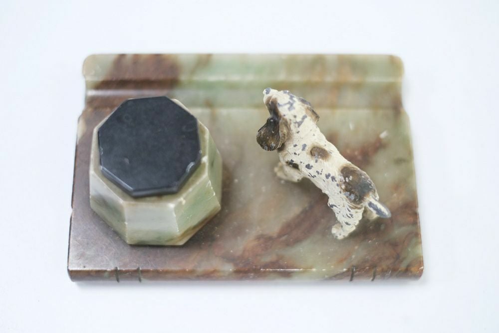 美しい様々な模様の大理石をベースに、小さなスパニエル犬がちょこんと立つ、アールデコの時代に作られた微笑ましいアンティークの文具です。インクボトルには専用の受け皿、蓋も現存しております。