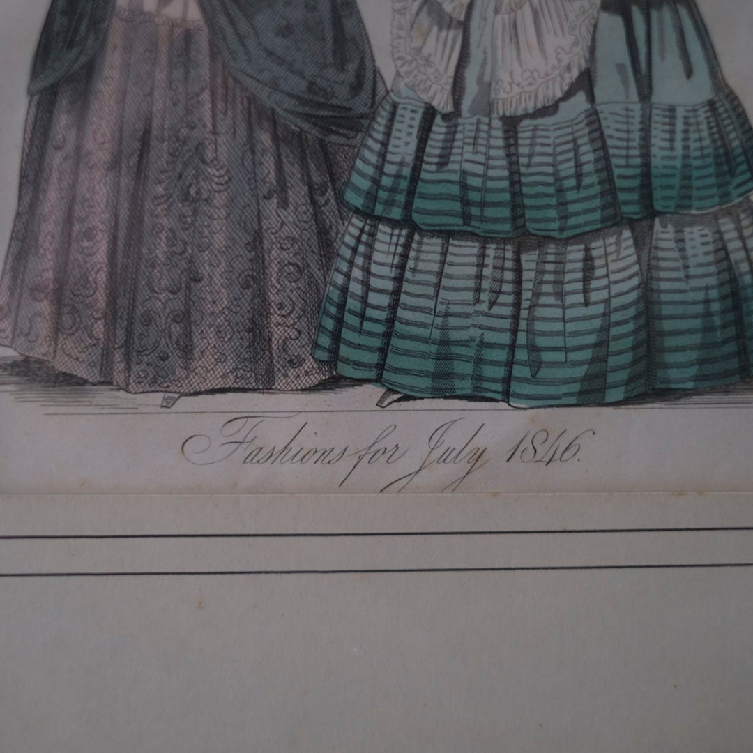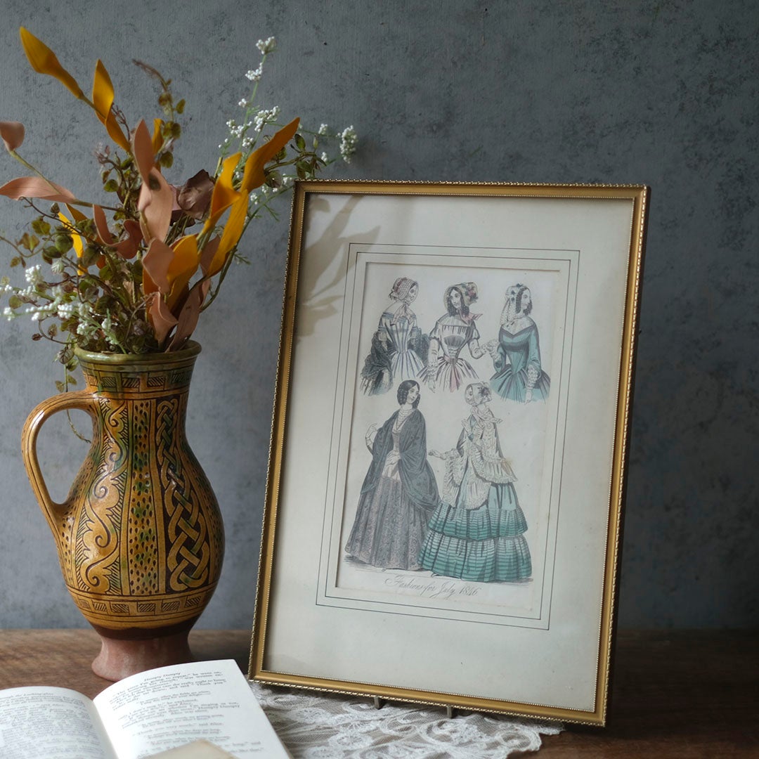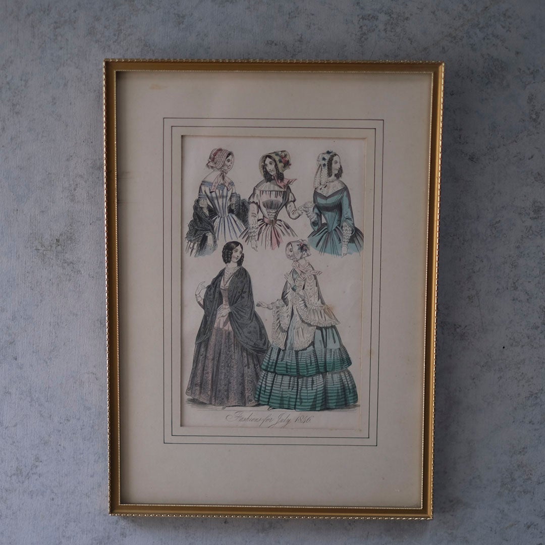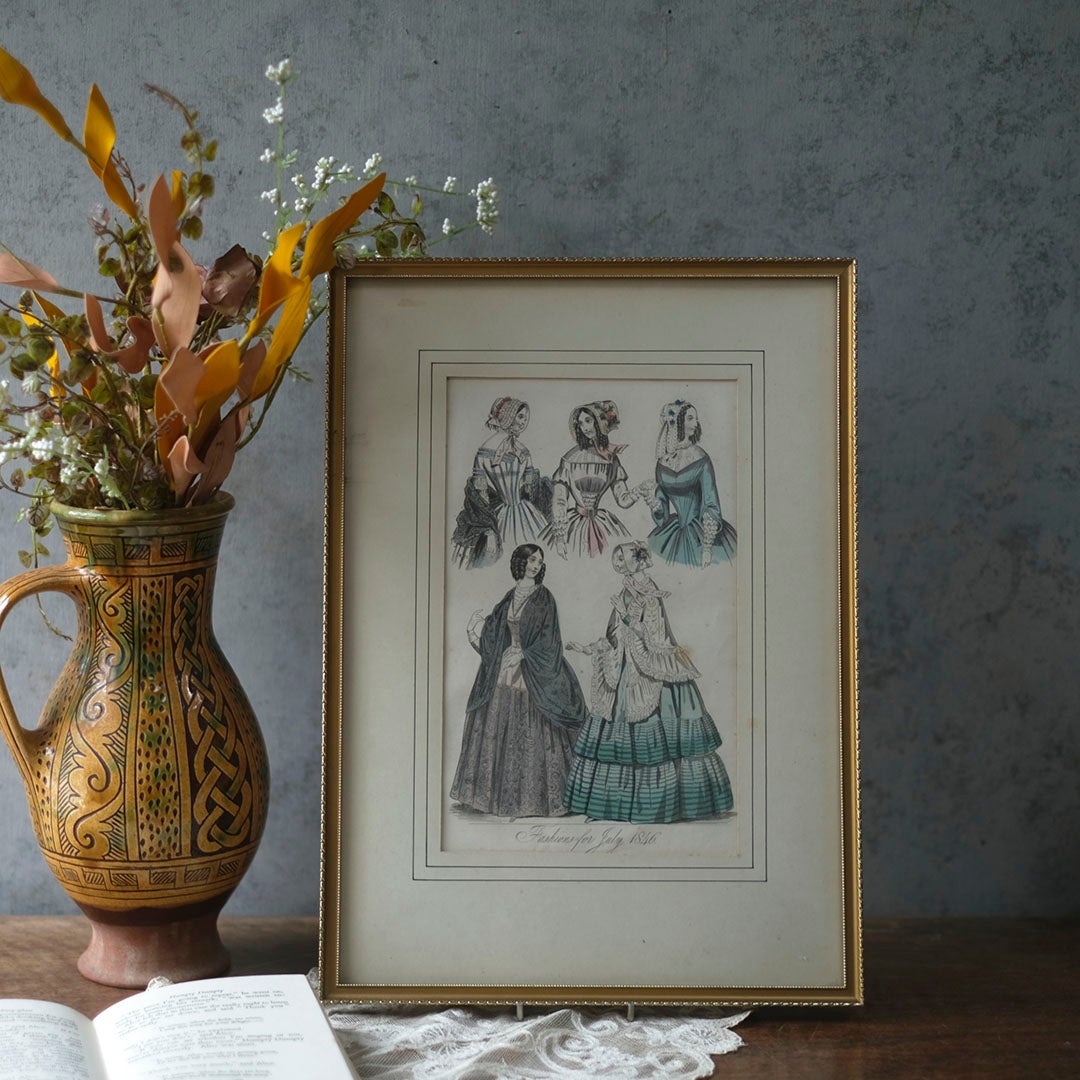 1846年、かつてのパリの街角で貴婦人たちが流行のドレスを眺めて心を躍らせていた、古いファッション雑誌「Le Moniteur des Dames et des Demoiselles」から切り取られた、石版画(リトグラフ)のアート。