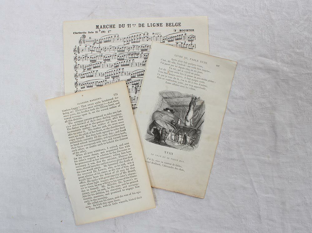 1864年に出版されたジャン・ド・ラ・フォンテーヌのイソップ童話集の美しい平版画によるリトグラフ。イソップ童話のリトグラフ1枚、楽譜2枚、古いページ1枚の合計4枚のセットです。