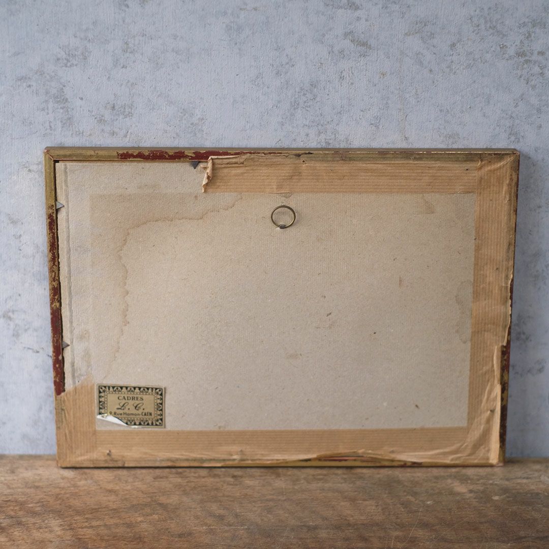 経年により額装には軽度の擦れがあり、枠紙には小さなシミなども見られますが、絵本体はとても綺麗な状態で保たれています。背面には金具が出ている部分がありますので、注意してください。気になる場合はマスキングテープなどでカバーしてください。