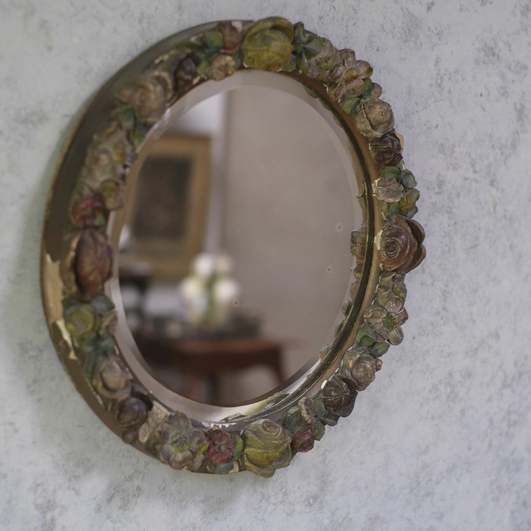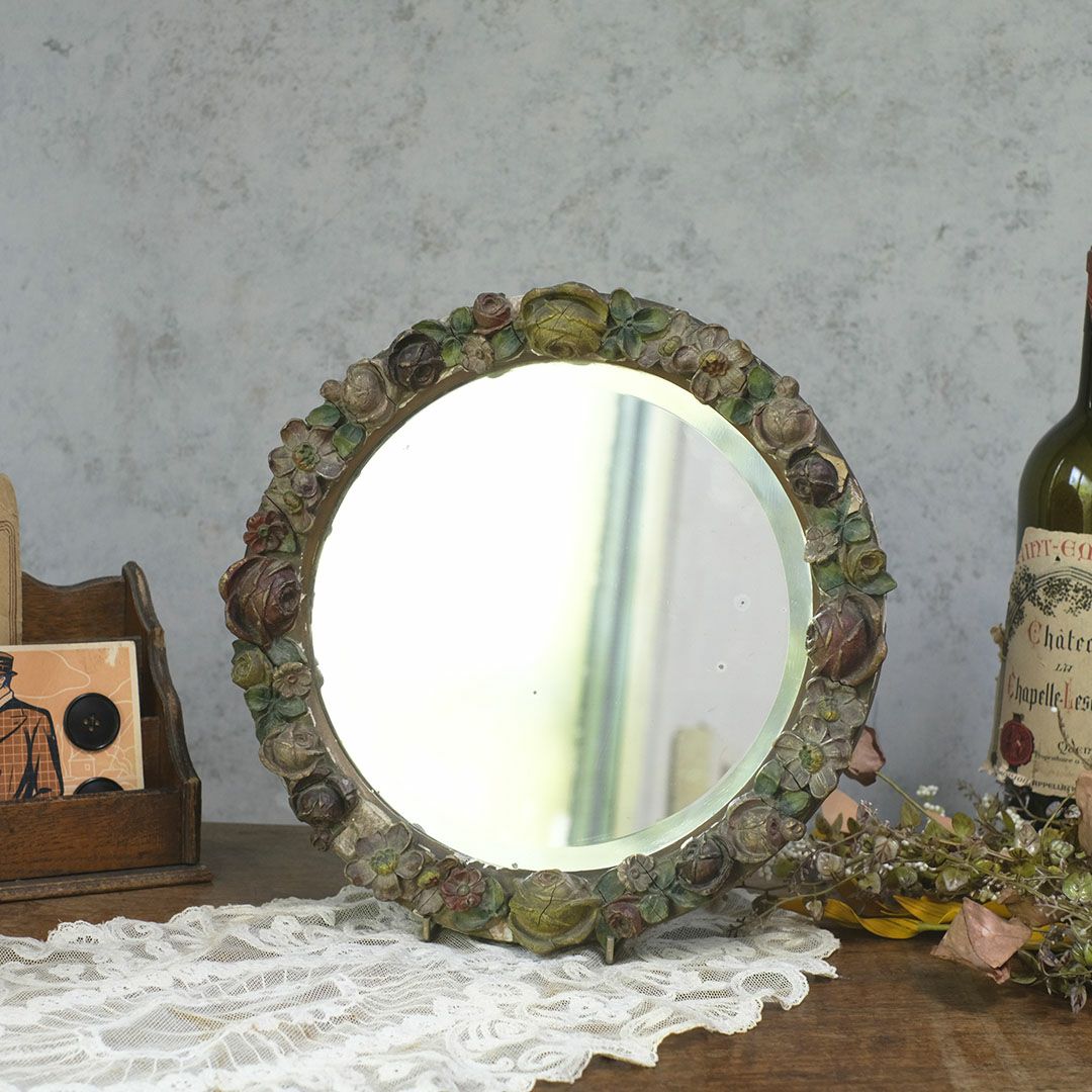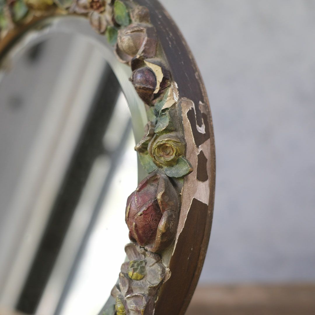 面取りされた厚みのある古い鏡面は、空間に奥行きを与え、アンティークならではの味わい深い雰囲気を演出します。色褪せた花々の装飾と石膏の質感が、時代を経た美しさをそのまま伝えており、まるでオブジェのような存在感で卓上や壁面を華やかに彩ってくれます。