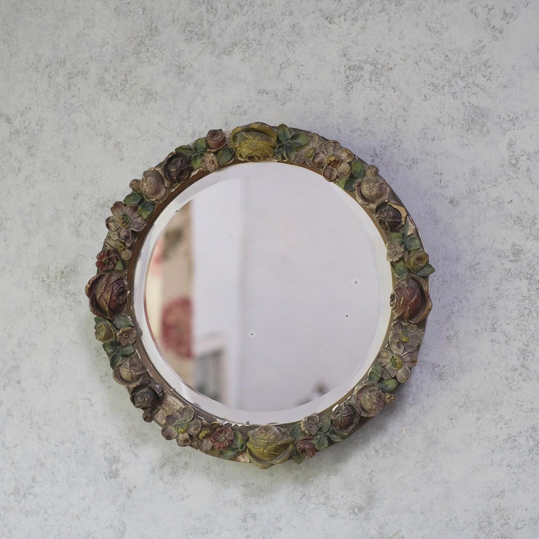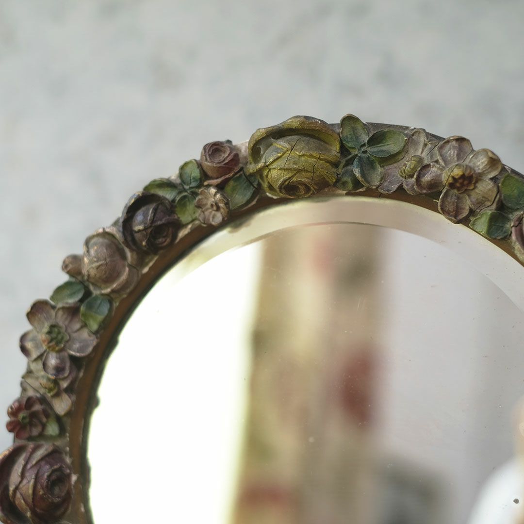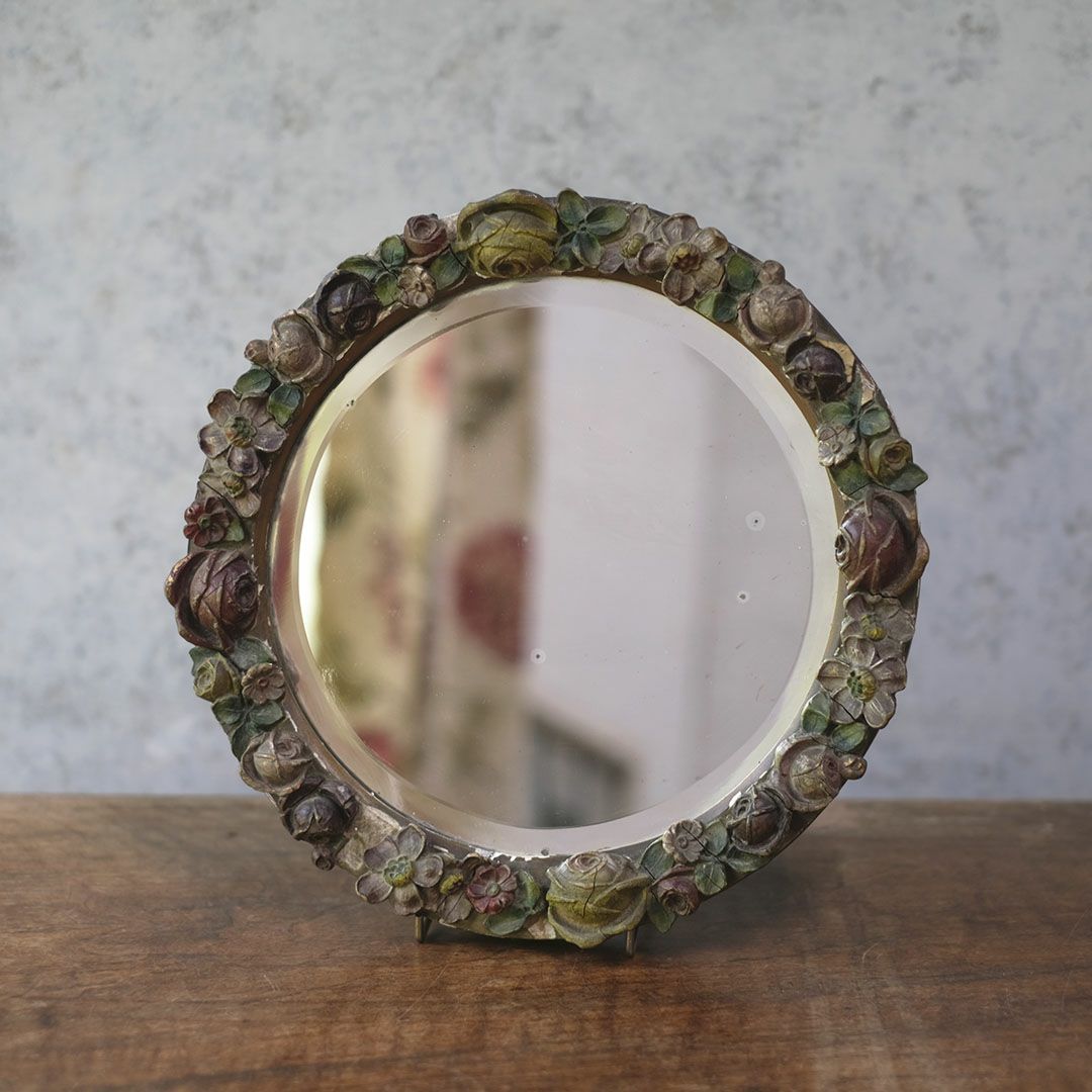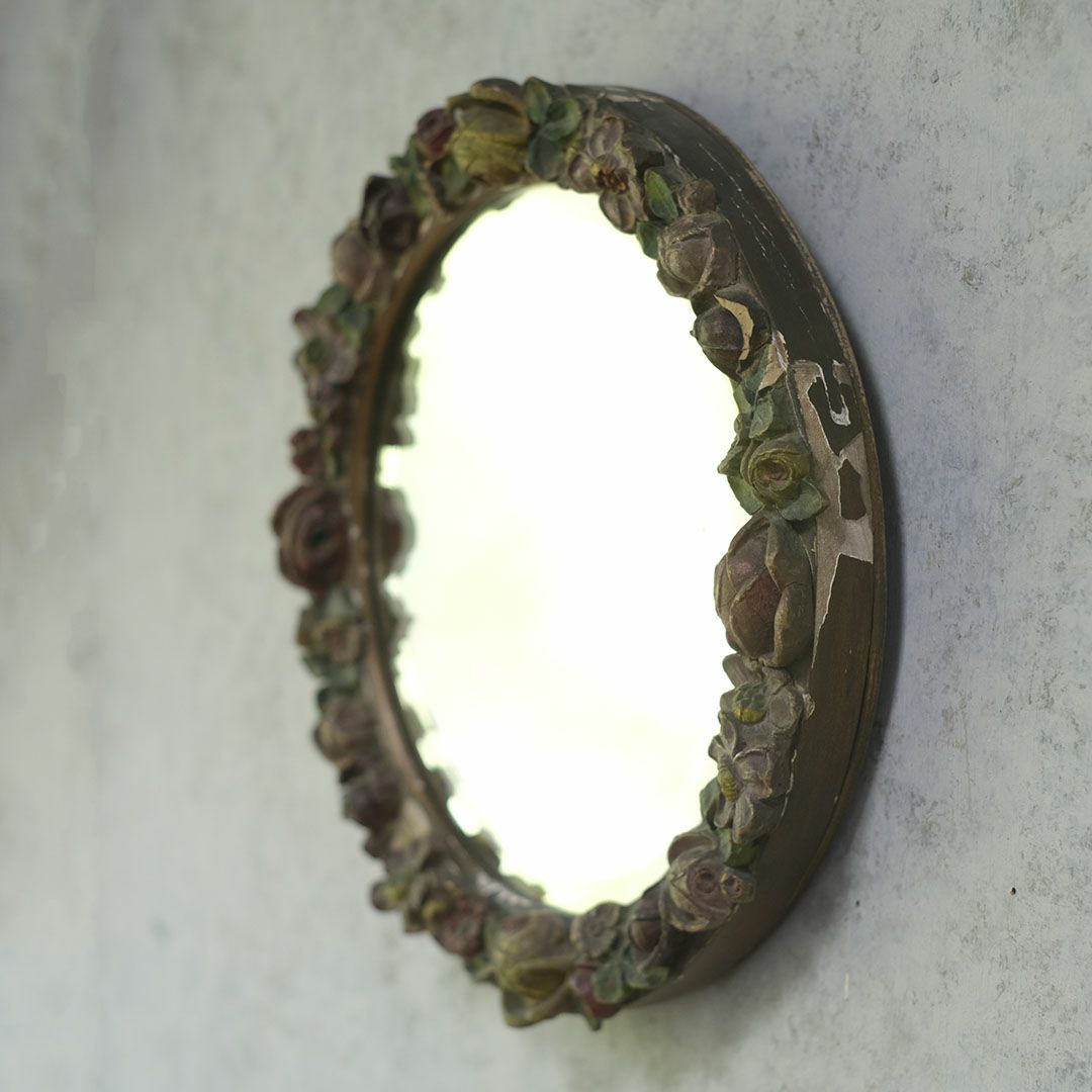 面取りされた厚みのある古い鏡面は、空間に奥行きを与え、アンティークならではの味わい深い雰囲気を演出します。色褪せた花々の装飾と石膏の質感が、時代を経た美しさをそのまま伝えており、まるでオブジェのような存在感で卓上や壁面を華やかに彩ってくれます。