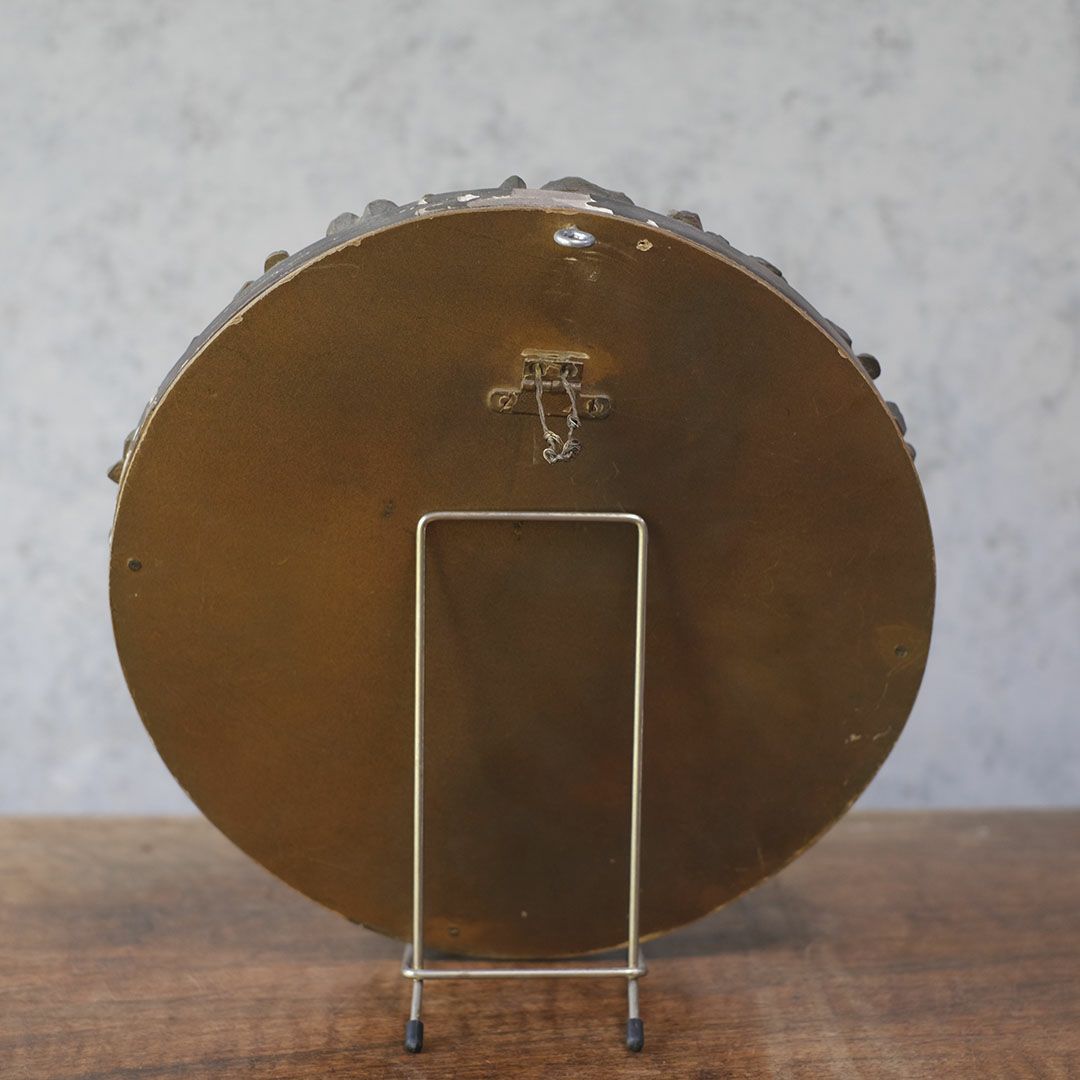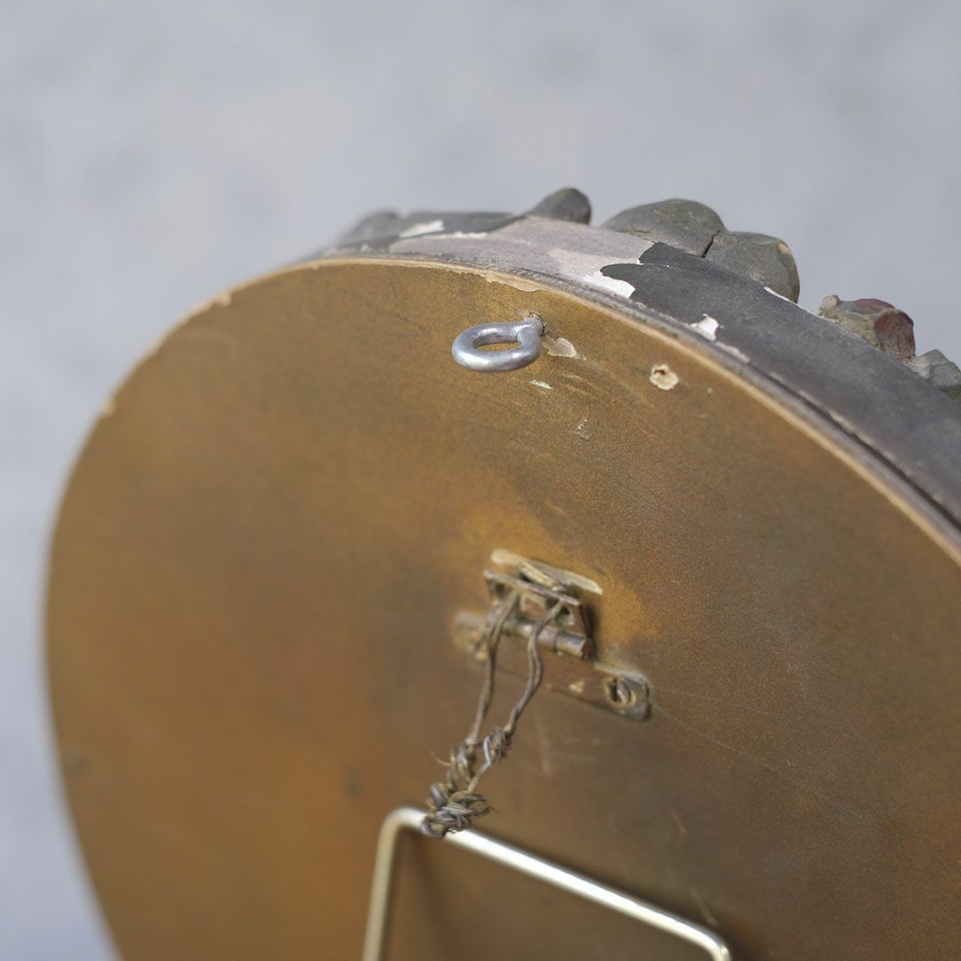 背面には壁掛け用の金具が付いており、立て掛けても吊るしても使用可能。1900年以前に作られた非常に古いお品のため、装飾に一部欠けが見られますが、それも含めてアンティークらしい風合いとしてお楽しみください。