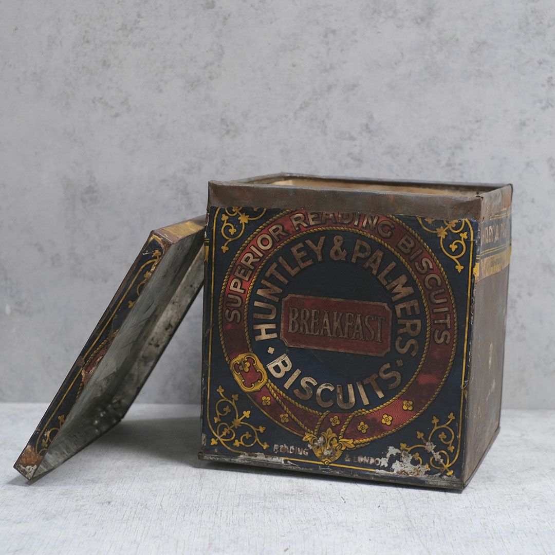 イギリスのビスケットメーカーHUNTLEY&PALMERS BISCUITSの大きなアンティークティンボックス。長い経年のため退色した質感がありながら当時のレトロなパッケージロゴが読み取れます。