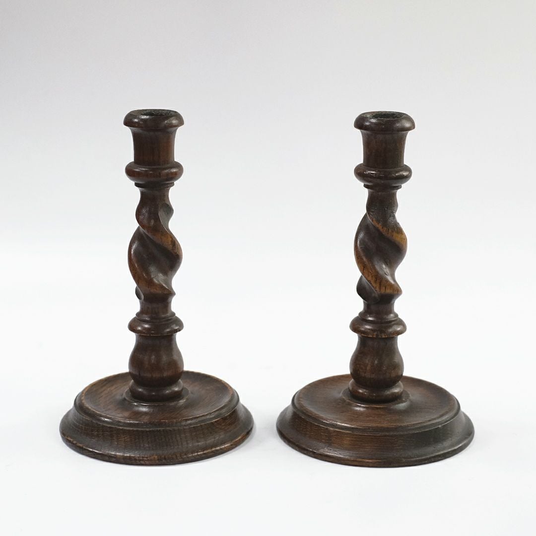 螺旋状の脚はバーリーシュガーツイストと呼ばれるジャコビアン様式の挽き物細工。渋みのある木目に雰囲気の漂う燭台です。
