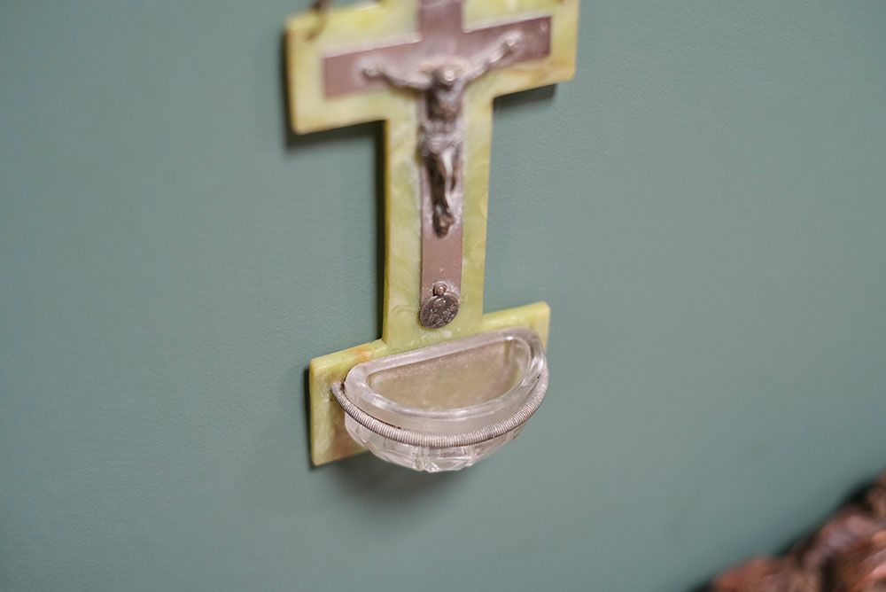 下部に付属した金属製の杯は祝別された聖水を入れるための受け皿です。