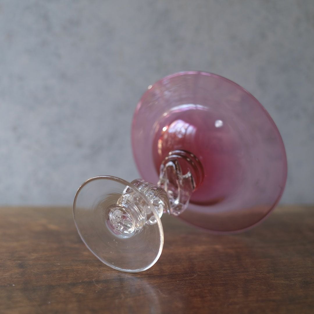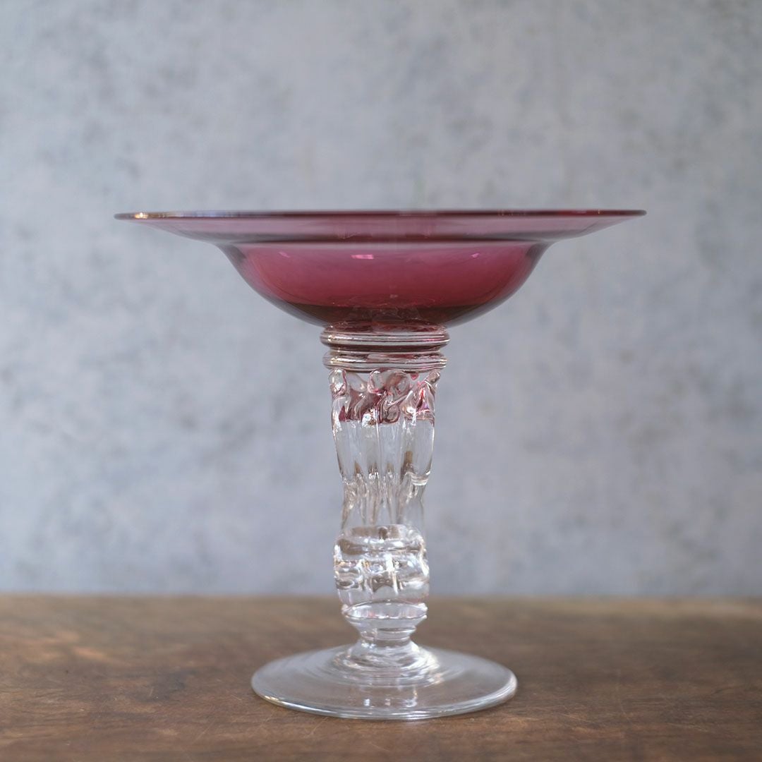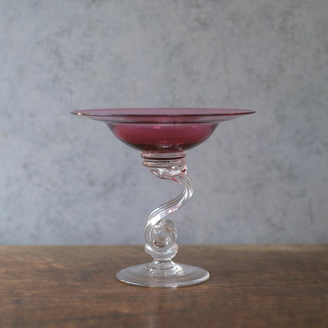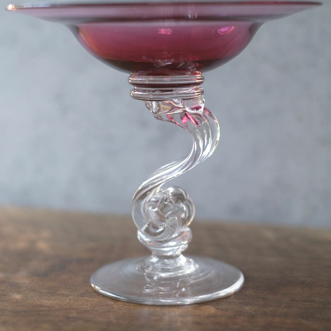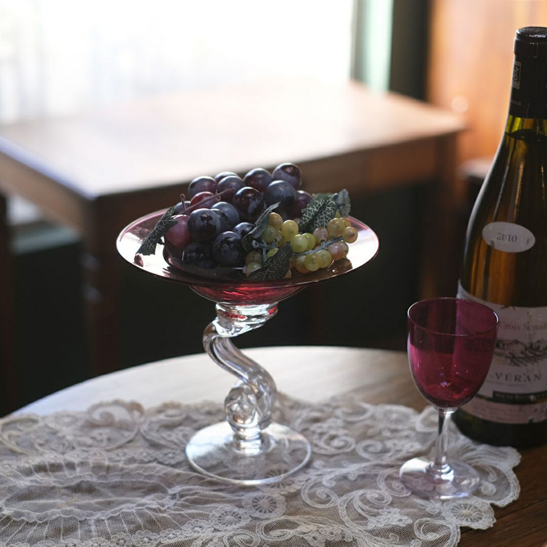 リムに向かってすっと広がる浅めのボウルに、渦を巻くようなS字カーブの脚部を組み合わせたデザインは、テーブルの上でひときわ目を惹く存在感。光を受けると、色ガラスのピンクがガラス越しにテーブルに落ち、まるでキャンドルの灯りのように柔らかな陰影を生み出します。