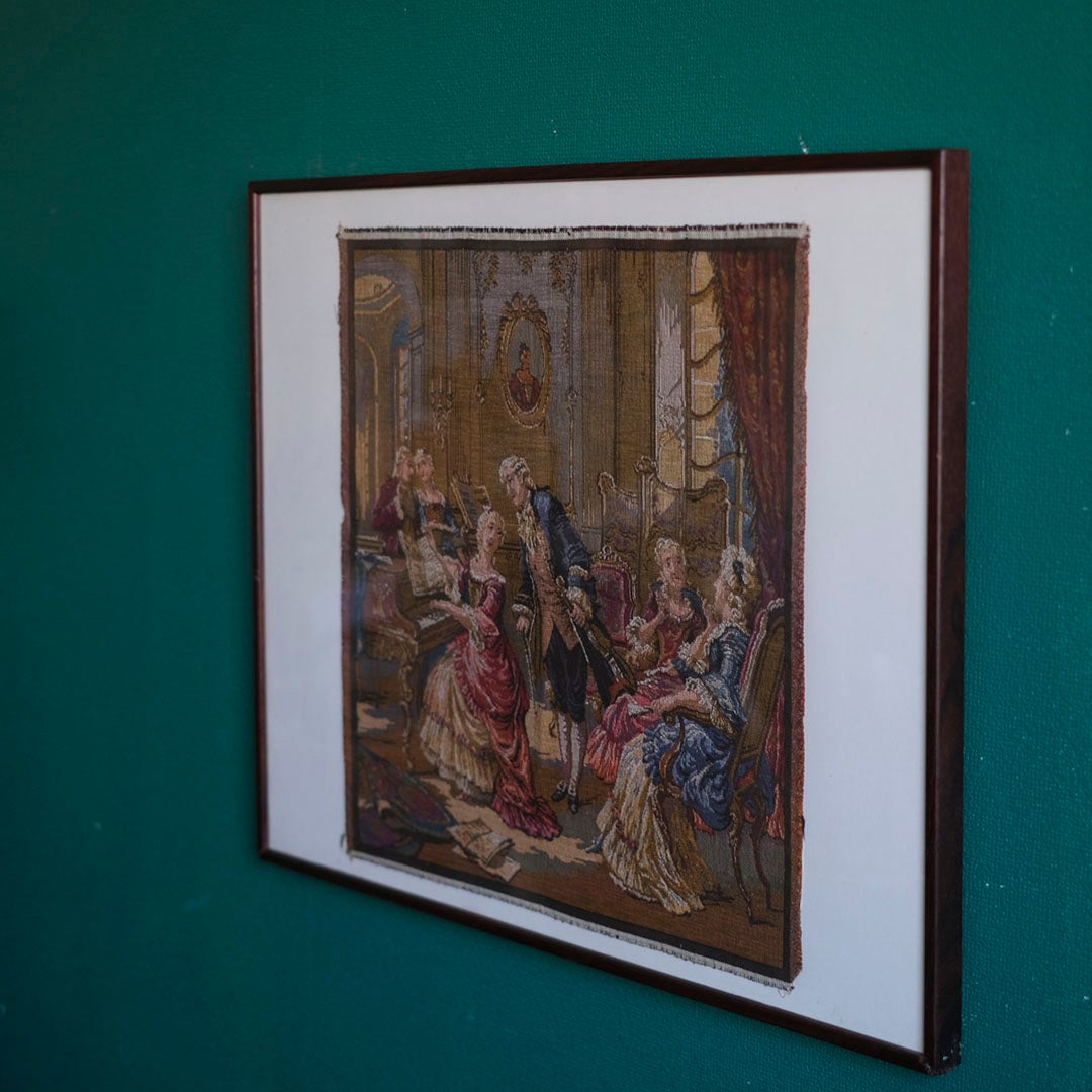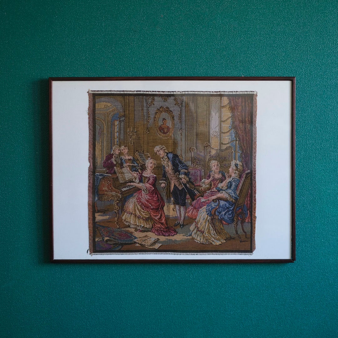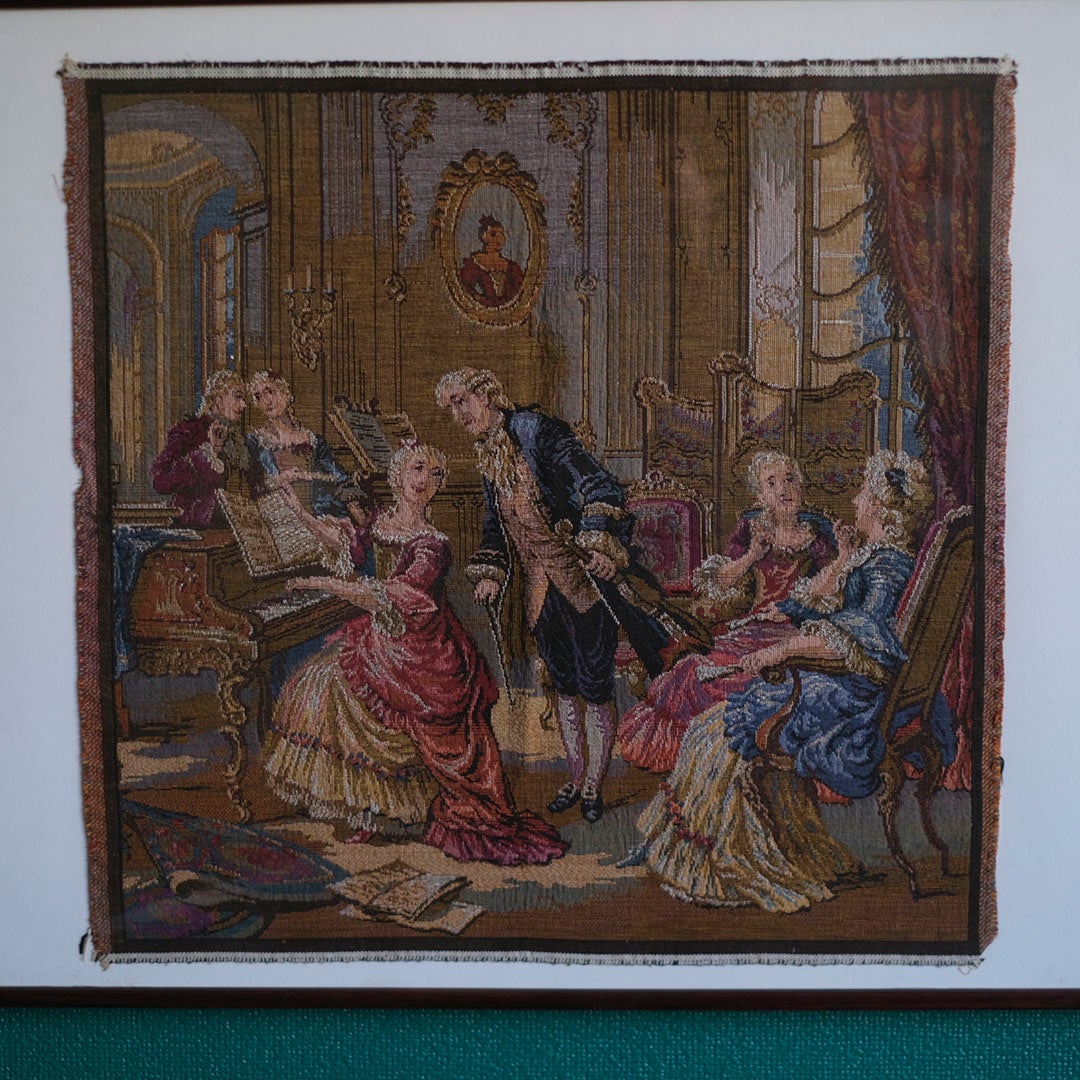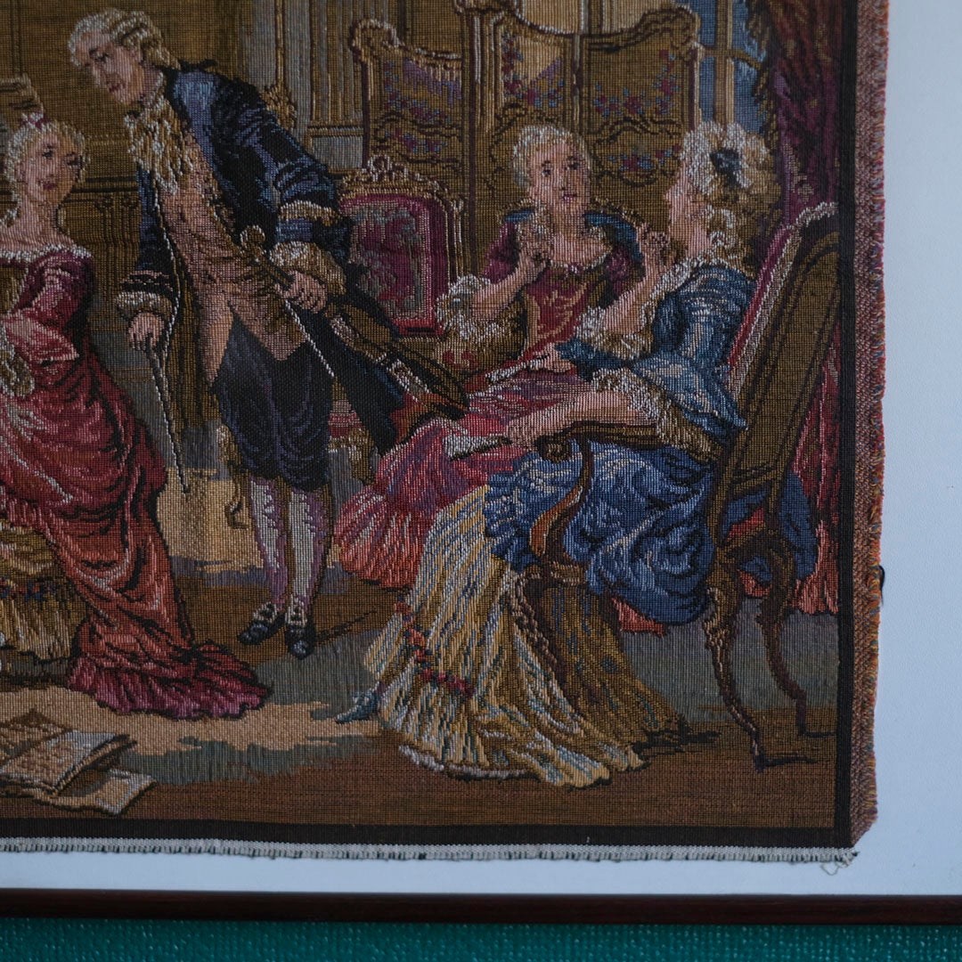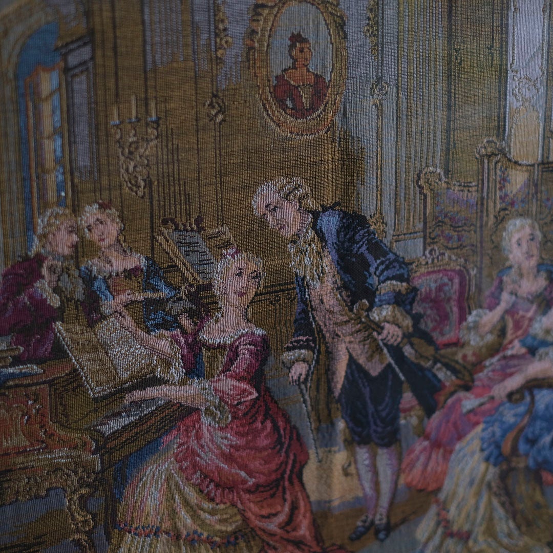 描かれているのは、当時の貴族たちが嗜んだ音楽会の一幕。チェンバロを奏でる女性、傍らで楽譜を覗き込む紳士、そして華やかなドレスを纏った貴婦人たちの語らい。色鮮やかな糸の交差によって、賑やかなサロンの息吹が鮮明に浮かび上がります。