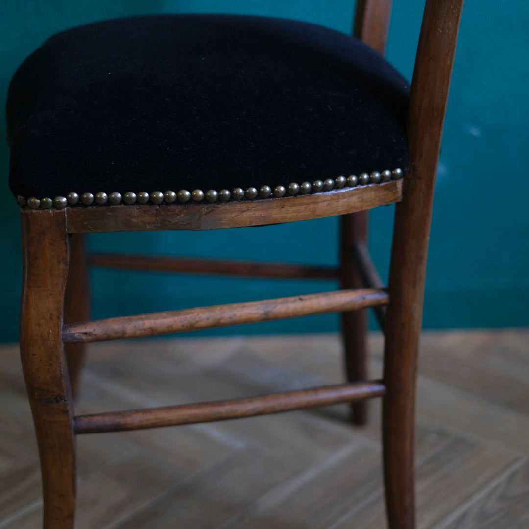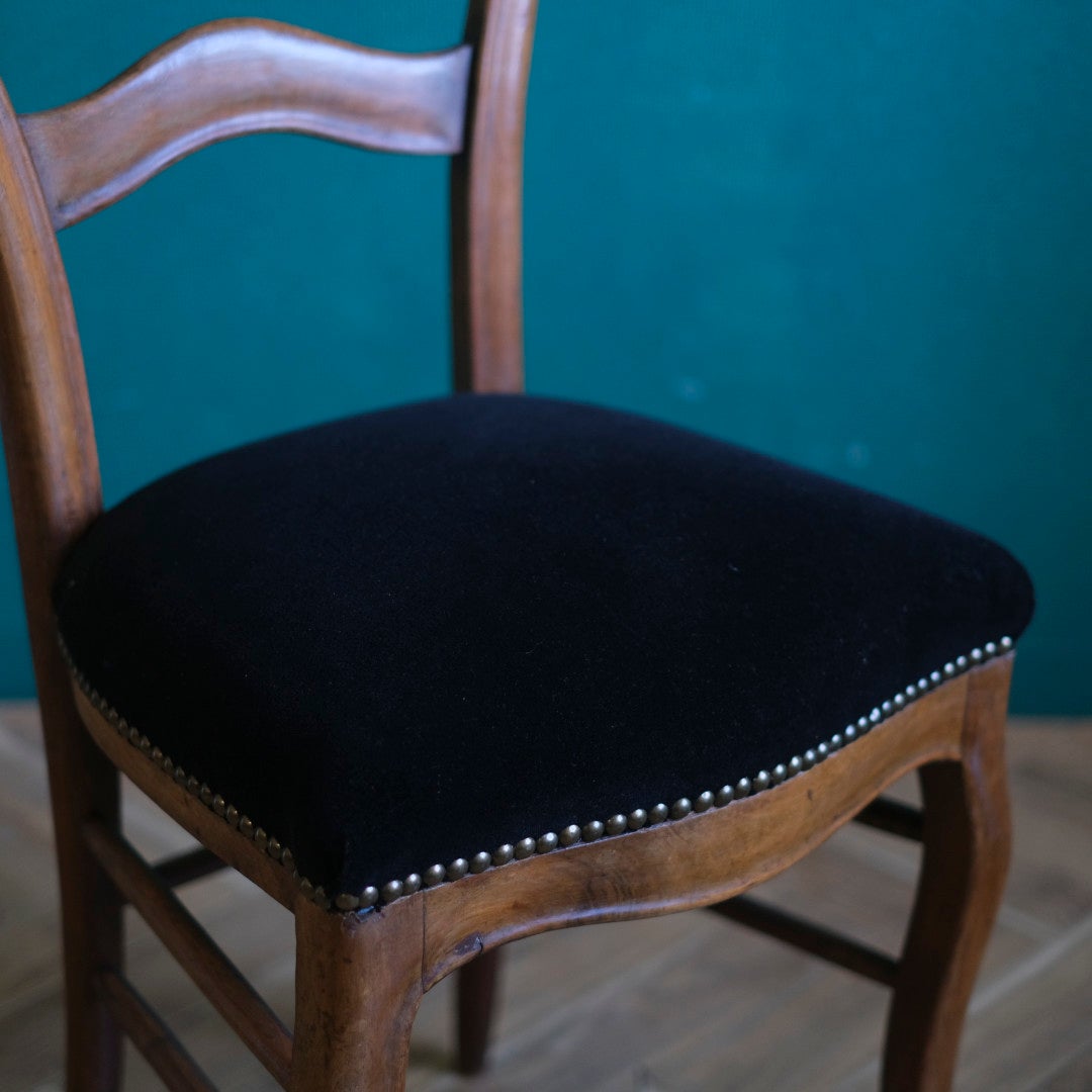 座面は日本国内の専門職人の手によって、シックな黒のベルベット生地に張り替えられています。縁をぐるりと囲むくすんだゴールドのスタッズが、上品なアクセントになっています。中材もしっかりとメンテナンスされているため、届いたその日からダイニングチェアやデスクチェアとして実用的にお使いいただけます。