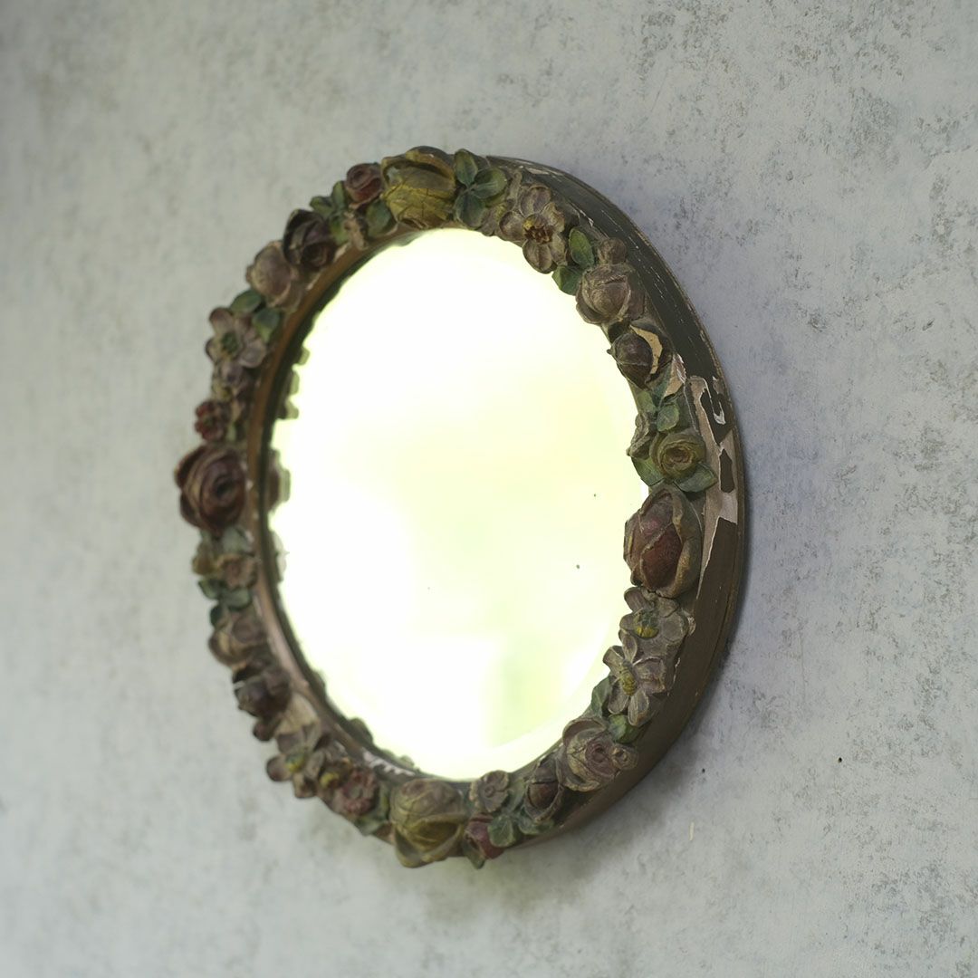 面取りされた厚みのある古い鏡面は、空間に奥行きを与え、アンティークならではの味わい深い雰囲気を演出します。色褪せた花々の装飾と石膏の質感が、時代を経た美しさをそのまま伝えており、まるでオブジェのような存在感で卓上や壁面を華やかに彩ってくれます。