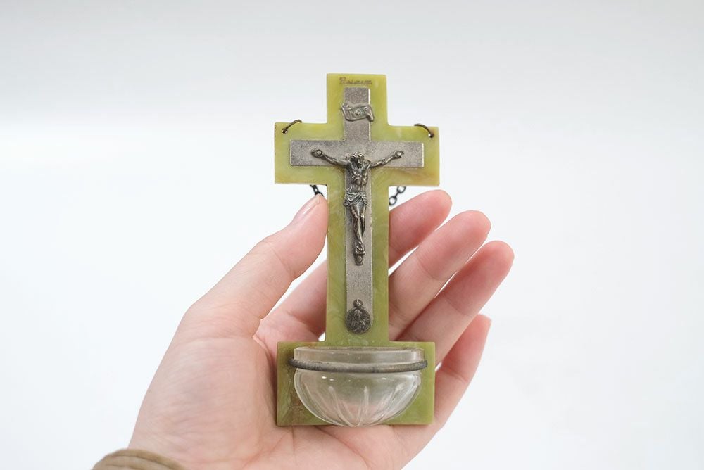 フランスのマーケットでみつけたアンティークの聖水盤(ベニチェ)。マーブル模様のプラスチック素材でできた珍しいタイプ。