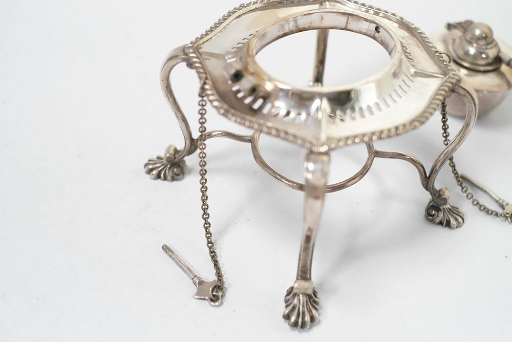 専用ウォーマースタンドとアルコールバーナーの全て揃った、貴重なアンティークシルバープレートティーケトル。豪華で優美なその容姿は、コレクションとして集めておきたくなるような魅力を持っています。