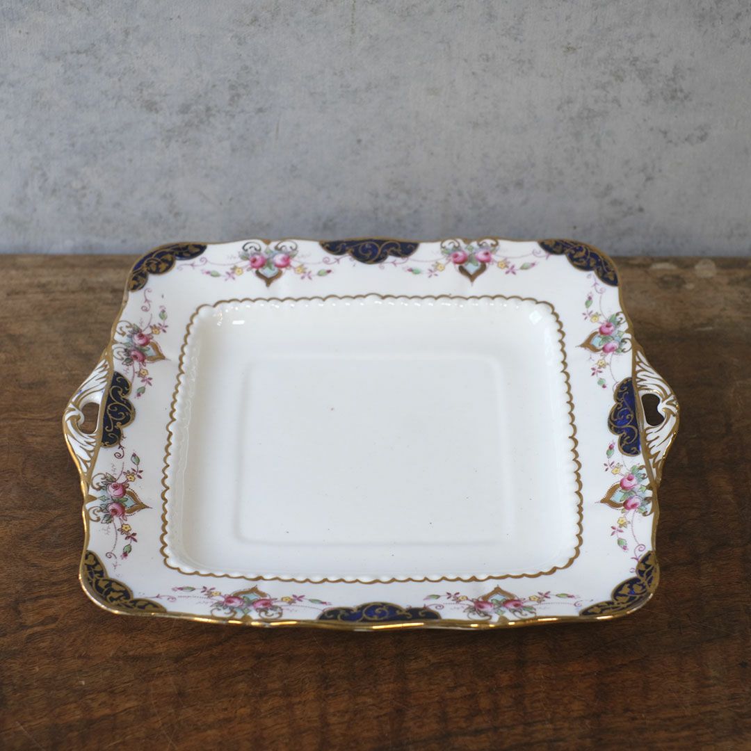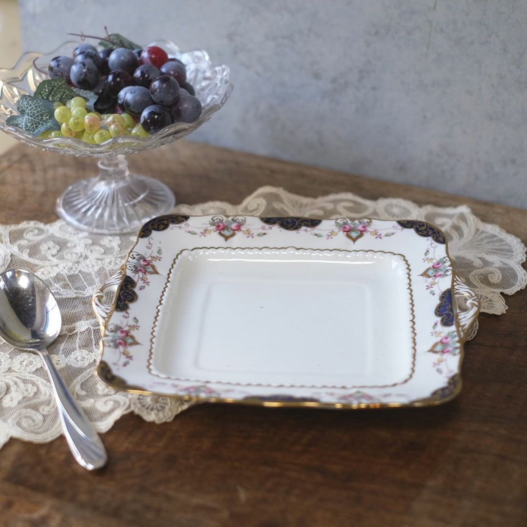 角のやわらかなスクエアフォルムに、さりげない金彩と小花を添えたヴィクトリアン・デザイン。キャビネットに立てかけて飾っても、食卓で実用しても、空間にすっとクラシカルな落ち着きを足してくれる一枚です。