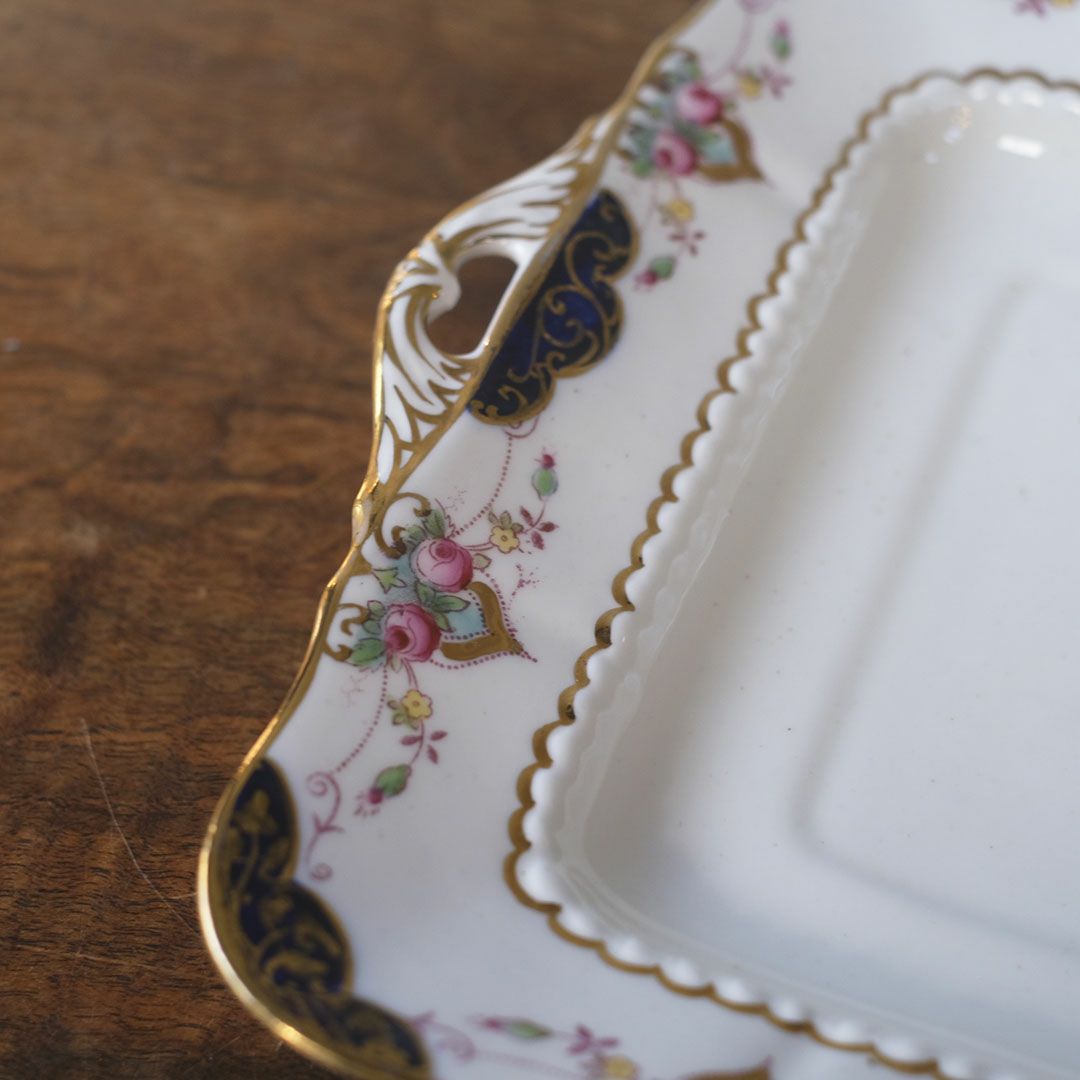 角縁はスカラップ状に波打ち、内側にも細かなレリーフの段差が付けられた手の込んだつくり。両サイドには透かし入りのハンドルが付き、金彩で縁取られた曲線がエレガントなアクセントになっています。ケーキやスコーン、フィンガーサンドなどを盛りつければ、まるでホテルのアフタヌーンティーのような雰囲気に。