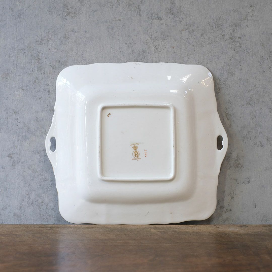 裏面には「LOUVAIN ENGLAND」と王冠マーク、モノグラムのバックスタンプ入りで、コレクションとしても嬉しいポイント。ケーキスタンド代わりに中央に置いたり、フルーツや焼き菓子を並べてサービングトレイとして使ったり、使わない時はキャビネットに立てかけて絵皿のように飾っても素敵です。