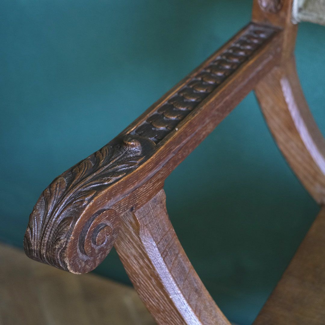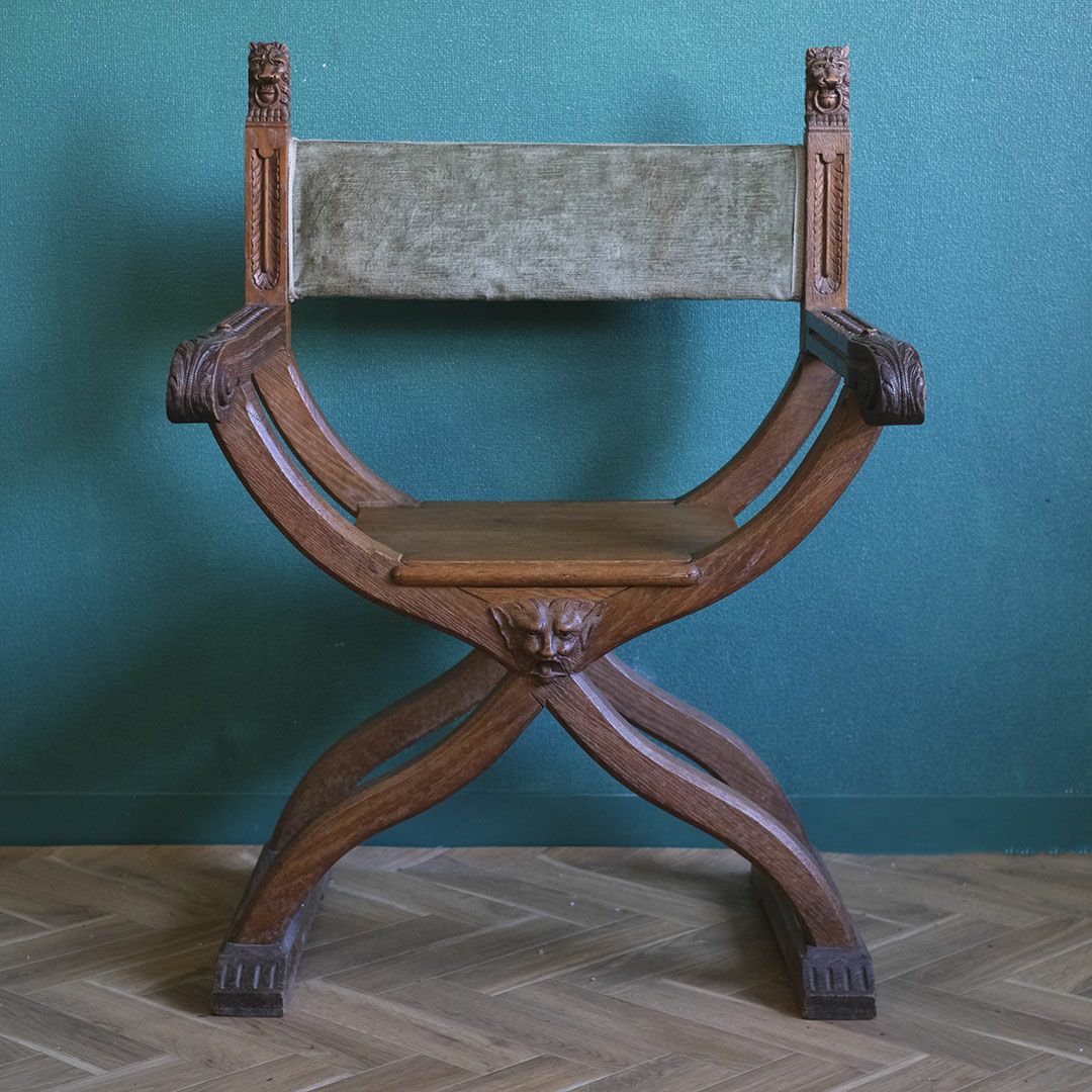 意匠はサヴォナローラチェア系のルネサンスリバイバル調で、起源はイタリアの系譜にありますが、このタイプはフランスでも人気で19世紀に作られました。