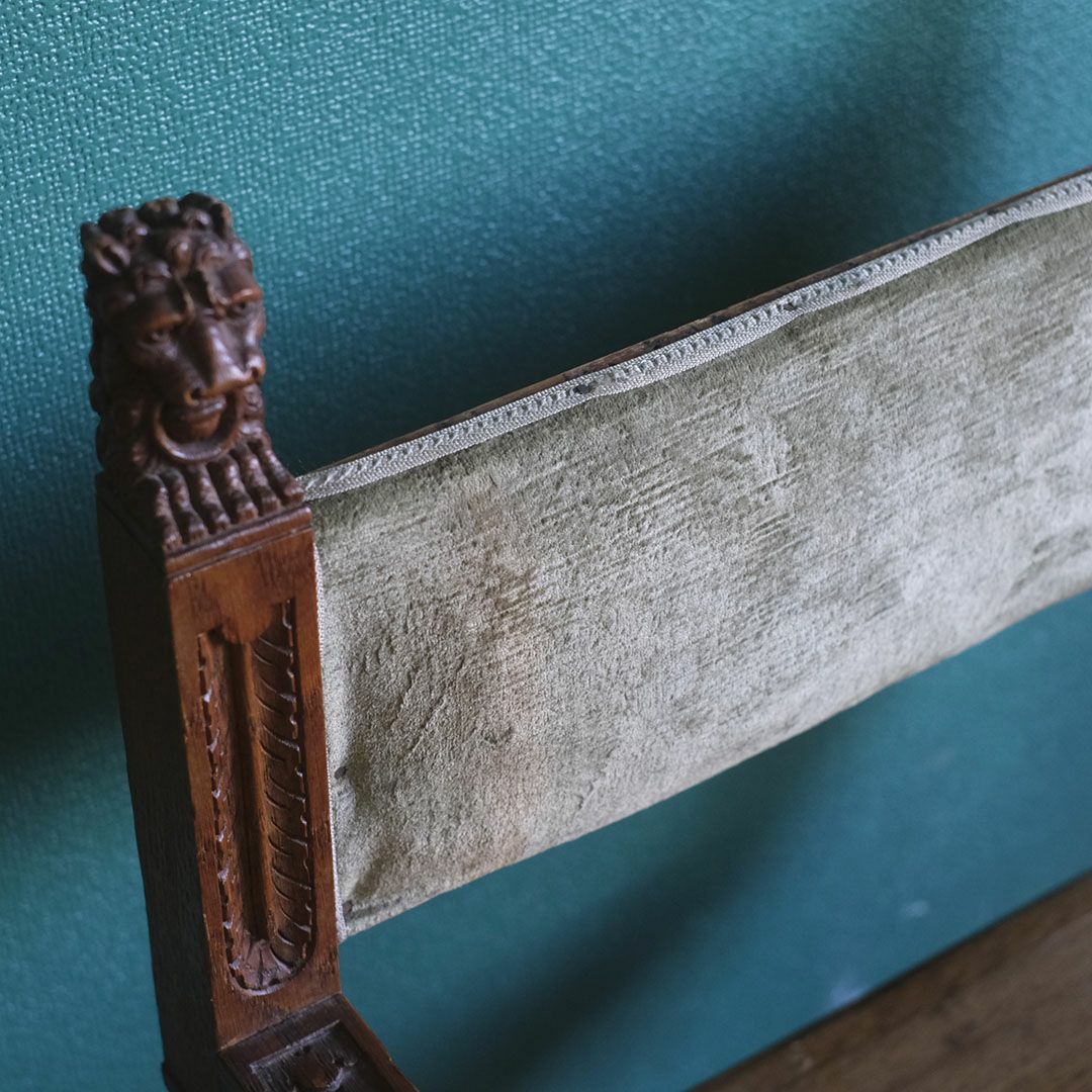 肘先にはアカンサスを思わせる彫り、背の支柱には獅子頭のレリーフとリングモチーフ。置くだけで部屋の空気がぐっと濃くなる、彫刻作品のような迫力をまとった一脚です。