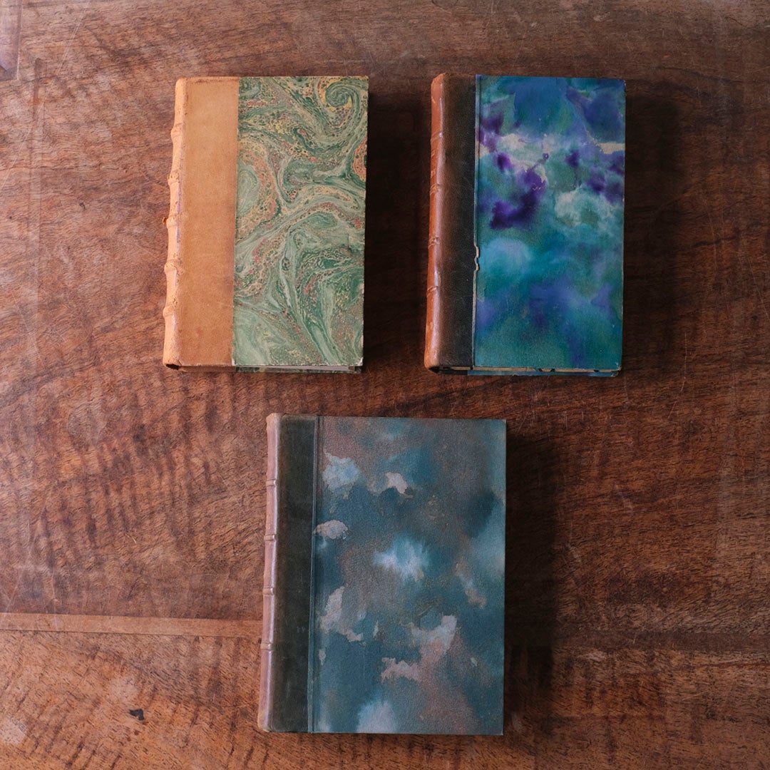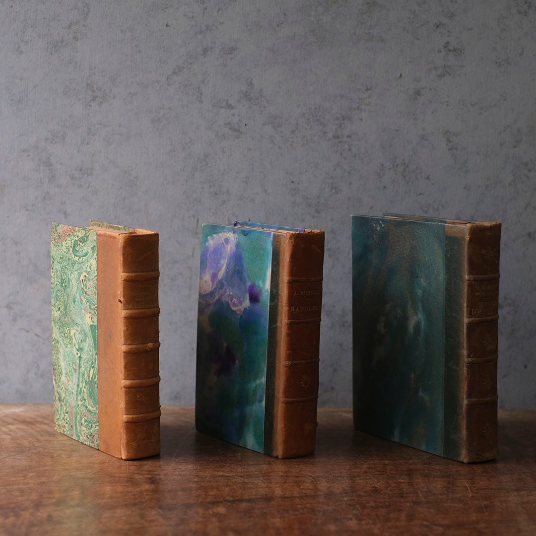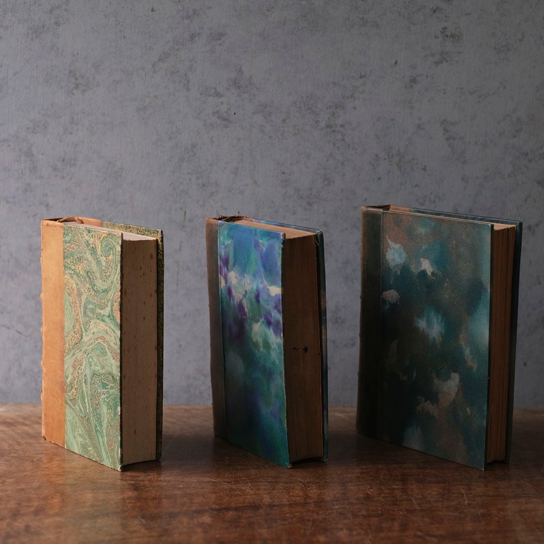 当時の職人が一冊ずつ手仕事で仕上げた「半革装(ハーフ・バインディング)」の端正な美しい装丁。背表紙を堅牢な革で補強し、平の部分には水面に浮かべた絵具を写し取った一点もののマーブル紙を貼る。100年前後の時を経て深い奥行きを増したその色彩は、現代の印刷物では決して辿り着けない、骨董としての確かな格調を物語っています。