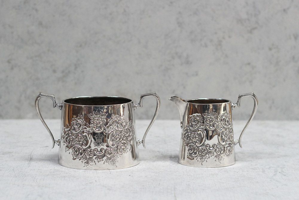 ルプッセ&エーヴィング装飾によって様々な模様が施されたやや大きめのアンティークシュガーポットとミルクジャグ