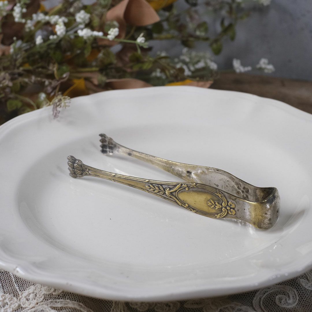 シュガートングとしての実用はもちろん、アンティークカトラリーのコレクションやディスプレイにもおすすめです。白い陶器や銀器と合わせれば、その繊細な装飾がいっそう引き立ちます。