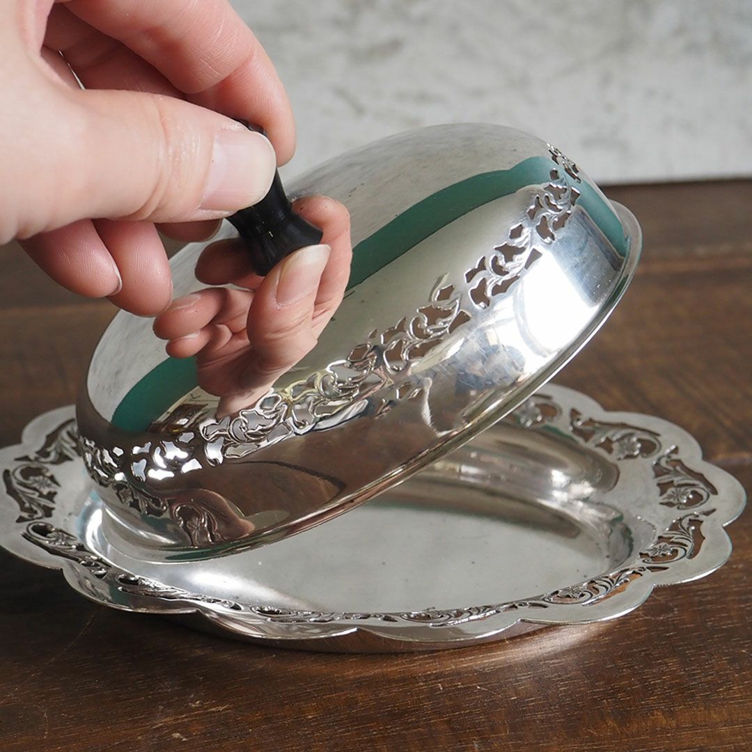 今回入手したものは食卓で使用するバター用の専用ケース。残念ながらガラスの受け皿は欠損しておりますが、ヴィクトリアンな装飾の可愛らしいシルバープレートのベース皿と、丸みを帯びた小さな蓋が素敵です。透かし細工のスクロール模様が上品なアイテムです。