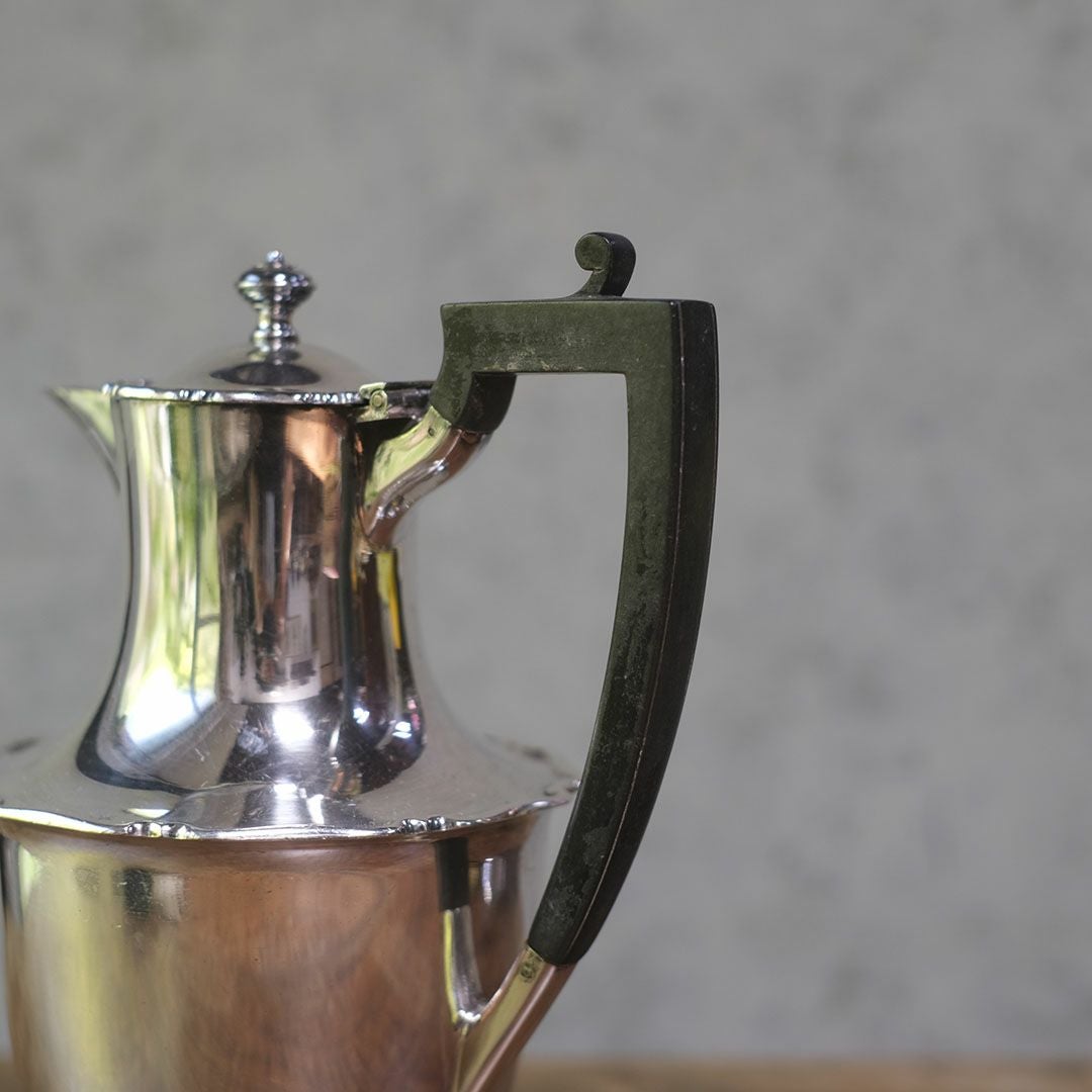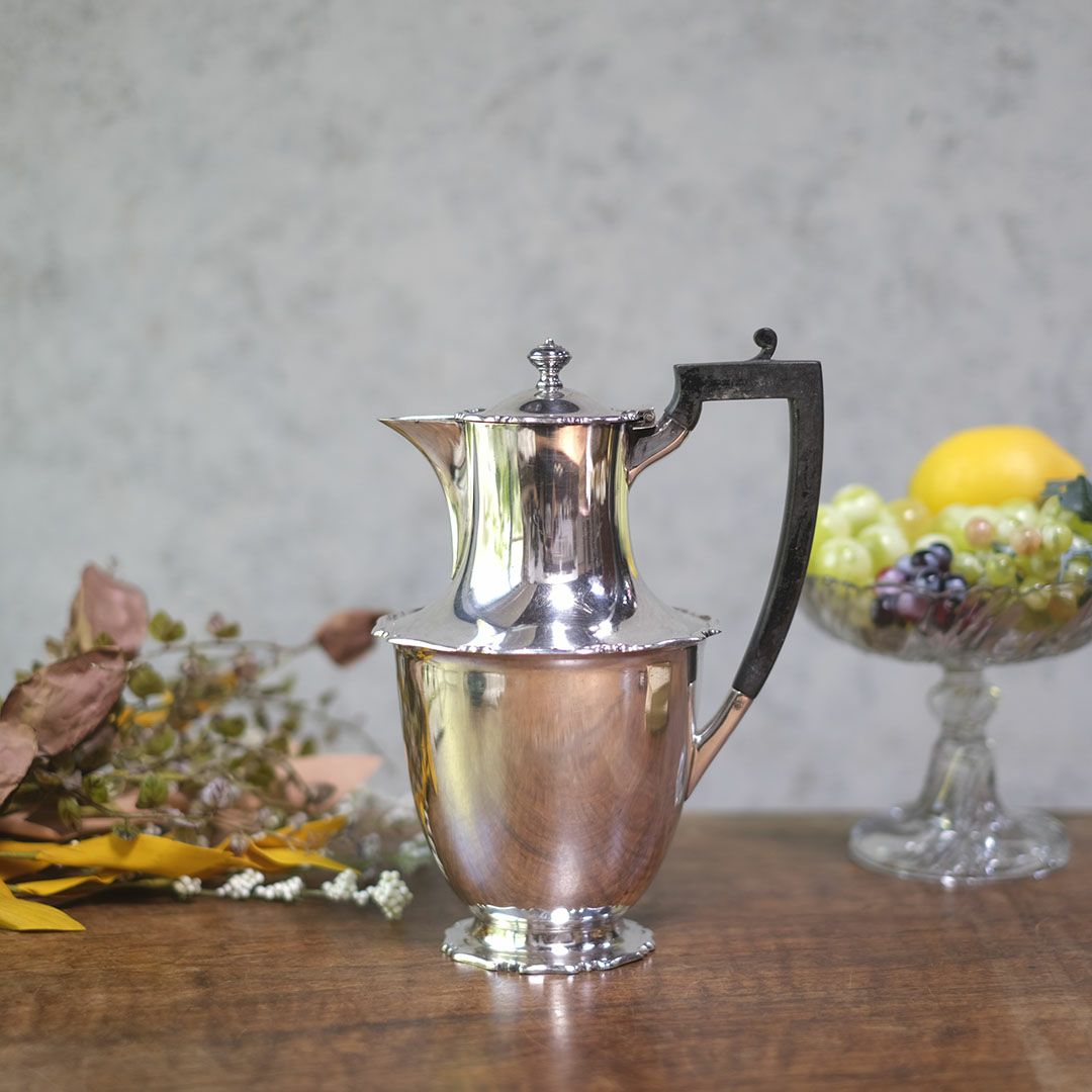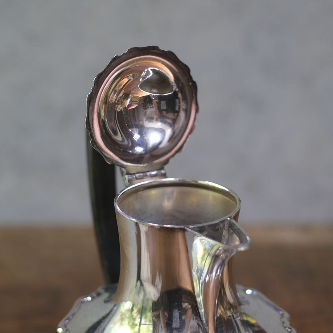 シルバープレートの美しい輝きと、黒檀(エボニー)ハンドルの重厚なコントラストが印象的な、イギリス製のアンティーク・ホットウォータージャグ。