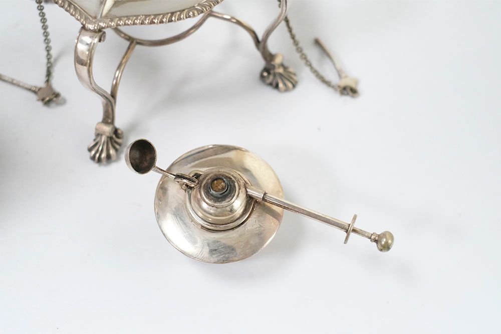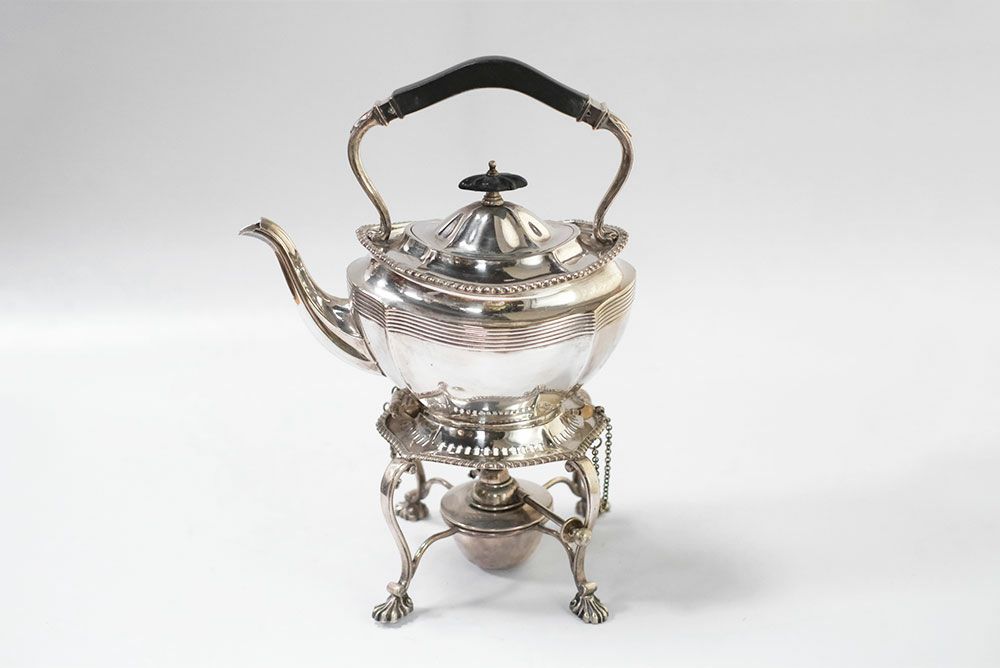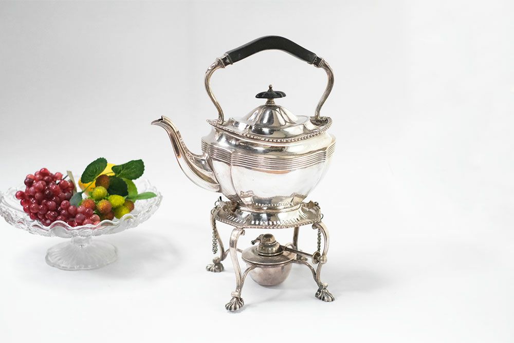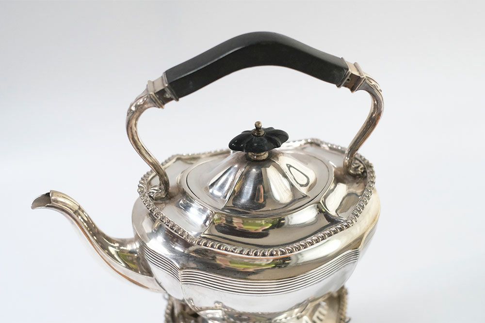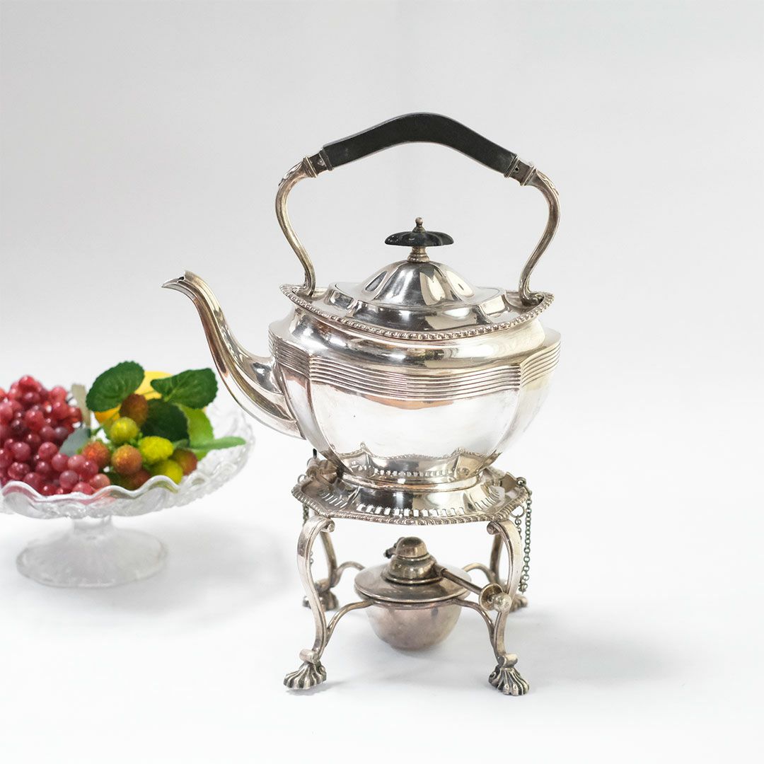 専用ウォーマースタンドとアルコールバーナーの全て揃った、貴重なアンティークシルバープレートティーケトル。豪華で優美なその容姿は、コレクションとして集めておきたくなるような魅力を持っています。