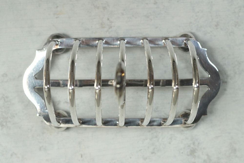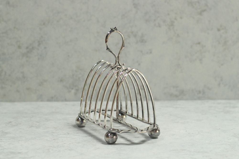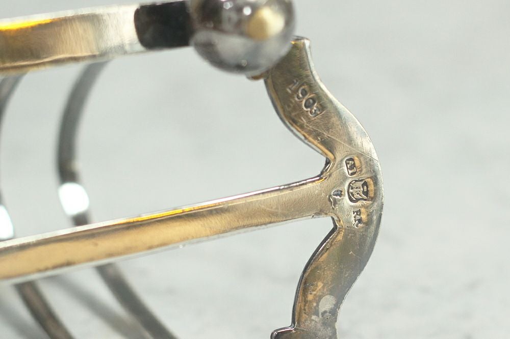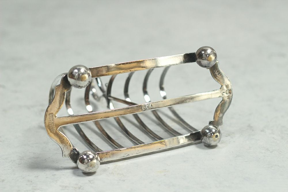 持ち手付きで焼き立てのトーストを食卓に置き使用するトーストラック。イギリスバーミンガムで作られたことが分かる、船のイカリのホールマークが入ったシルバープレート製です。