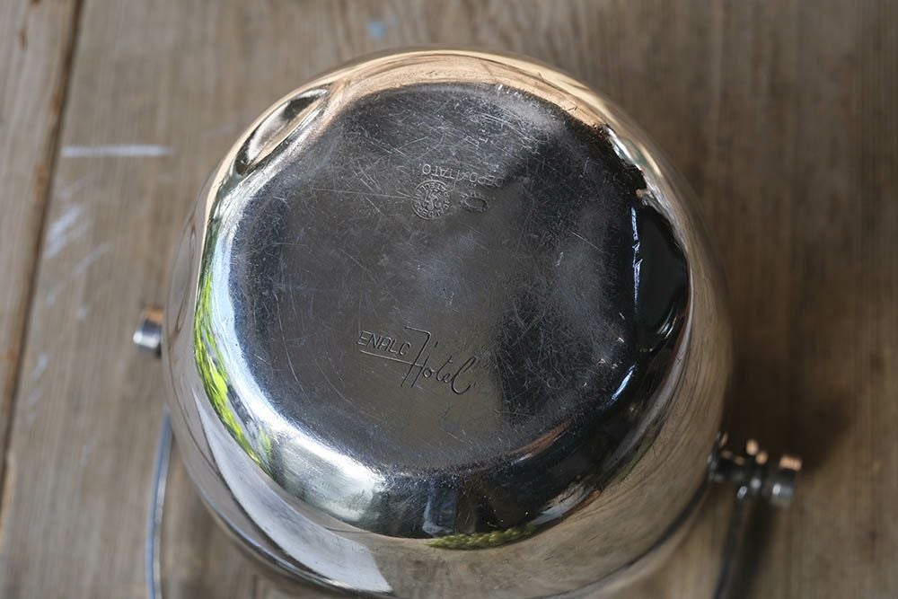 シンプルな形状のシルバープレートで作られたアイスペール。一見するとただのヴィンテージ品ですが、こちらの商品は、イタリアのホテル「enalchotel」で使用されていたもの。現在はホテルマンやシェフなどを育成する為のエナルクホテル学校となっています。